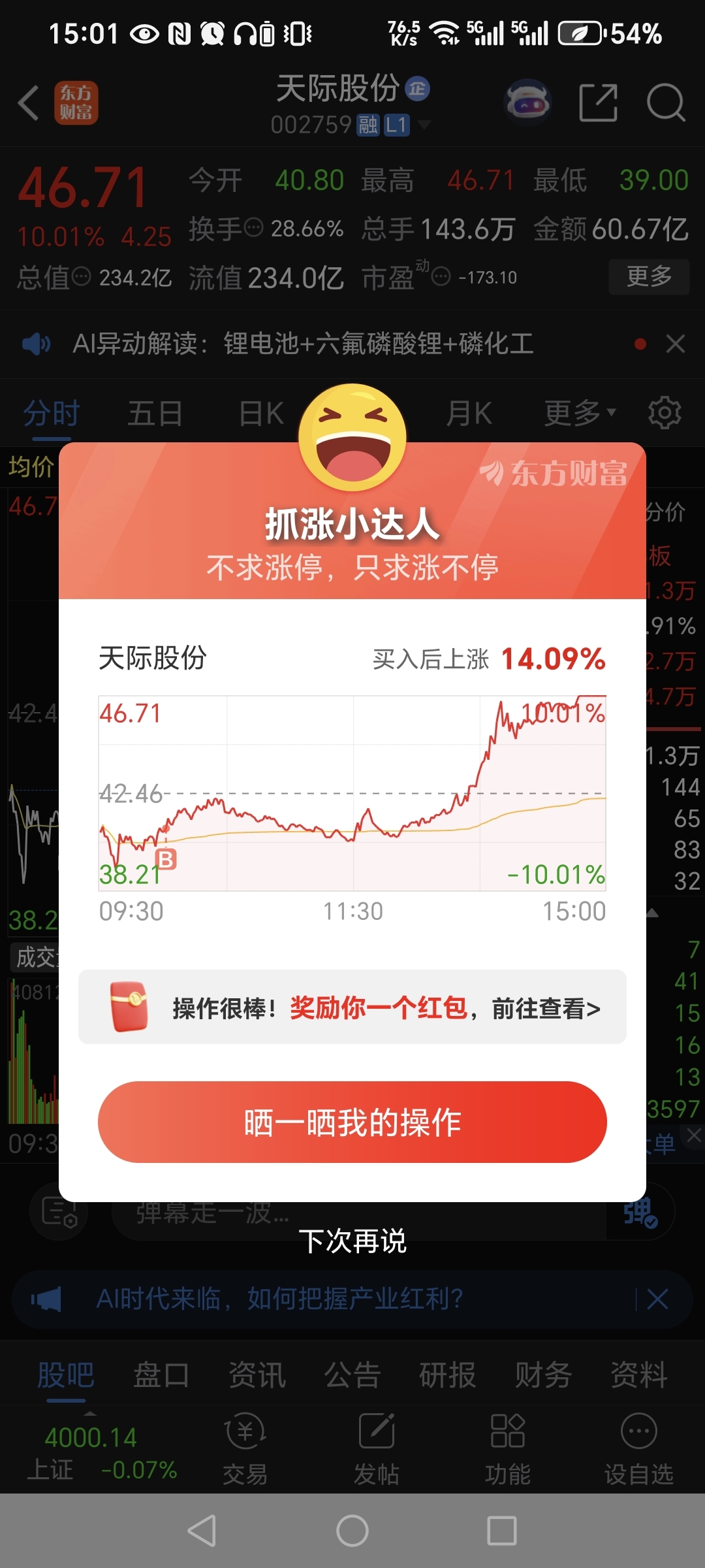 $天际股份(SZ002759)$ 浅浅的赚了14个点,哈哈