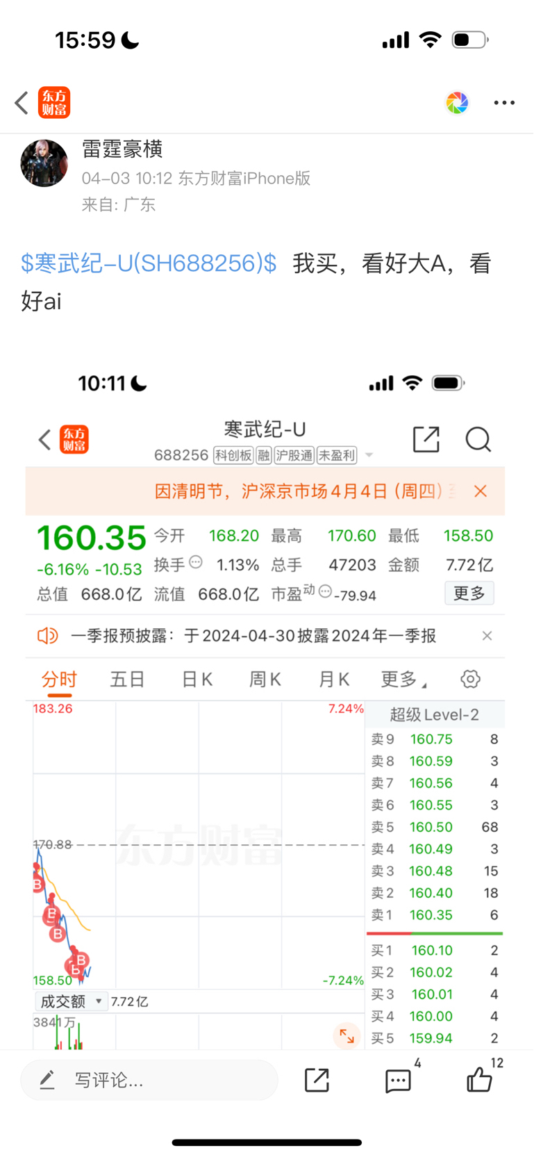 我这股才赚150个点,也没多少,这种我现在根本不看,就拿着,比起我的10倍寒武纪