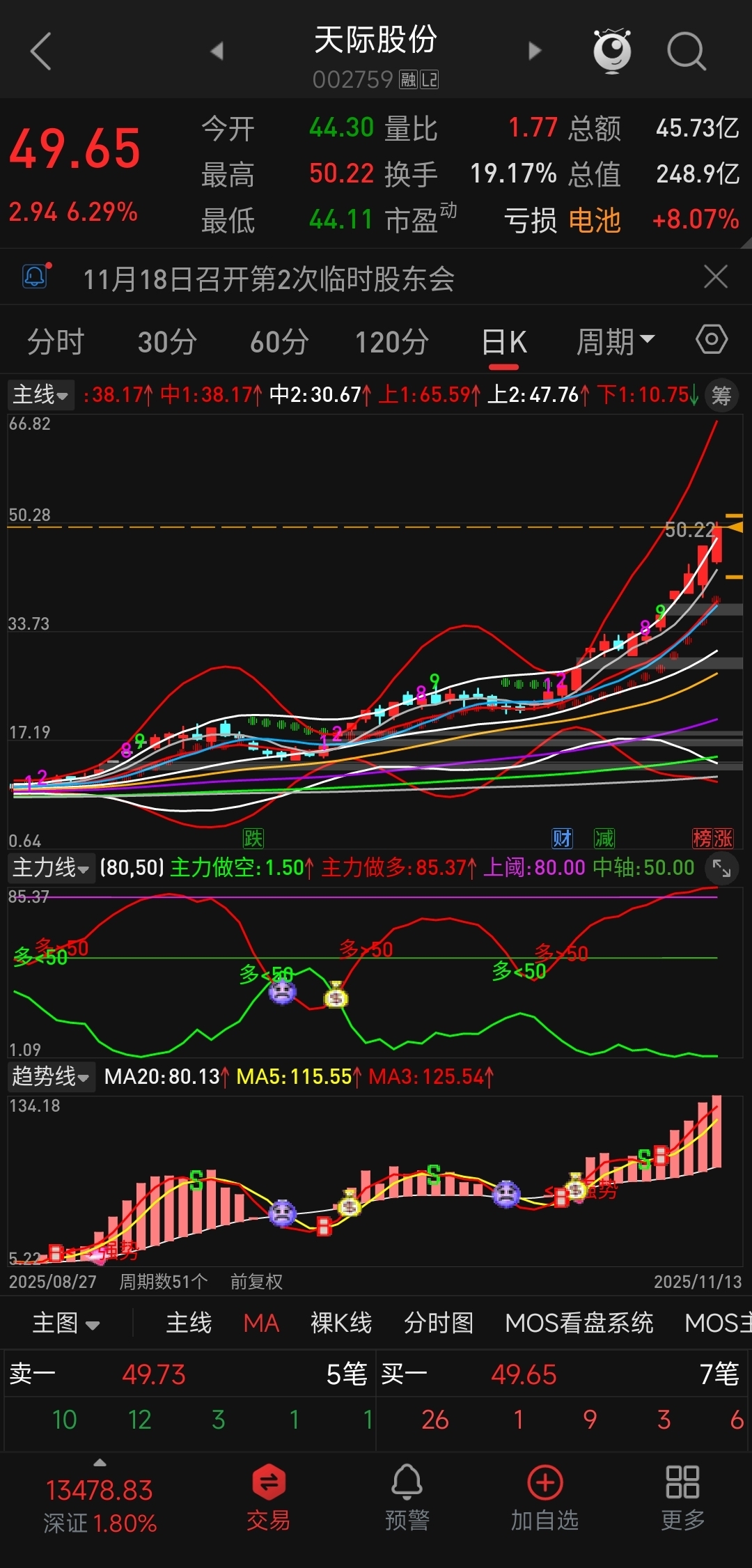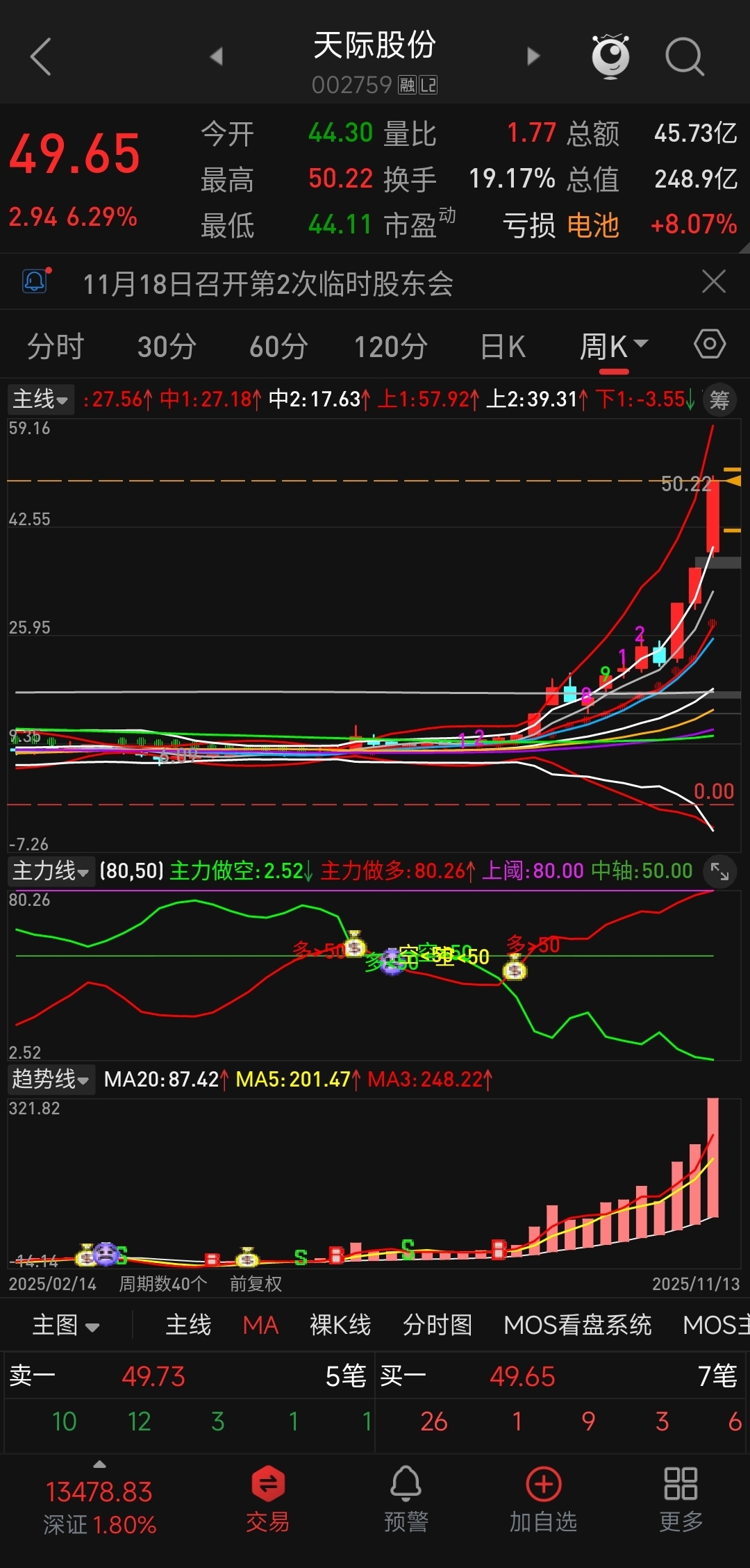 直冲天际,冲破2021年最高点。日线的主力做多线也冲上云端了。