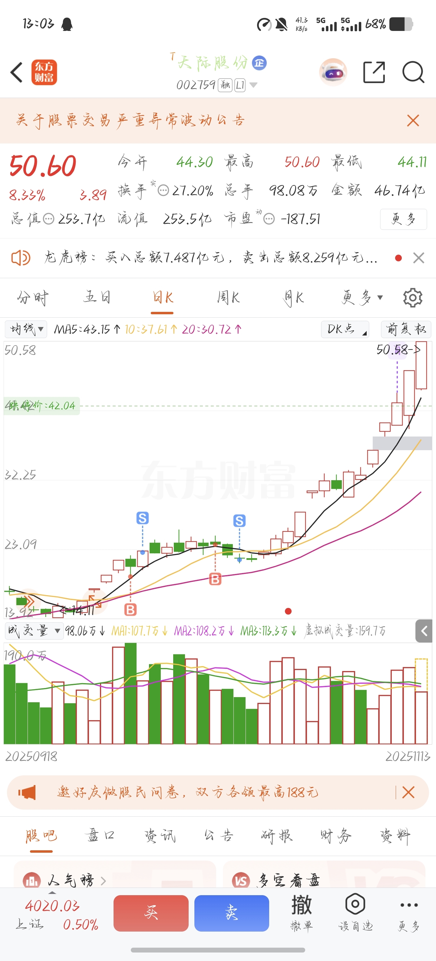 $天际股份(SZ002759)$ 一买就跌,一卖就涨,不买它就一直涨