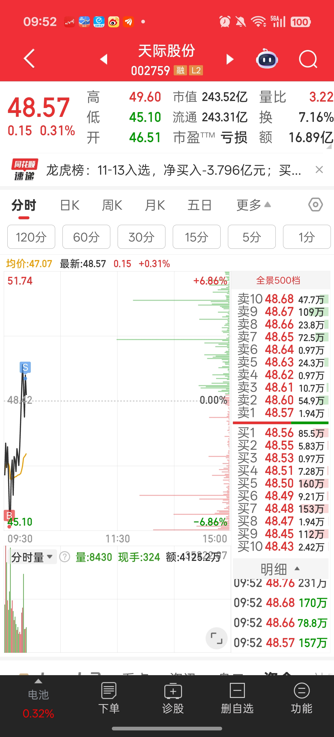 $天际股份(SZ002759)$ 2成仓位T出来了,留一成天高任而飞!