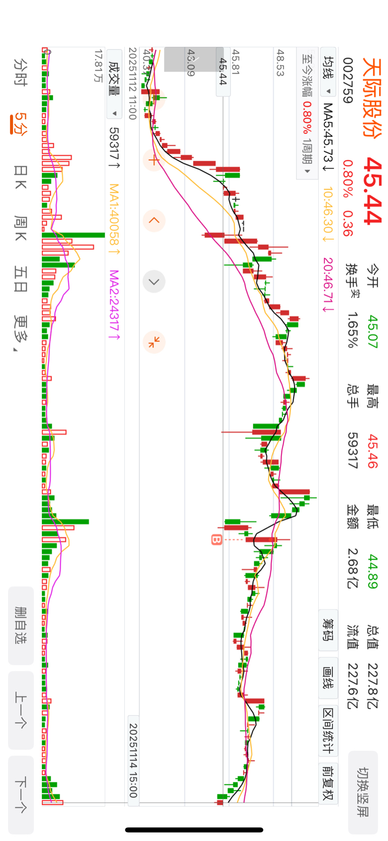 $天际股份(SZ002759)$ 简单说下我的理解,新主力在防守,今天是被大盘尾盘带下来的,很多股尾盘一小时都是这种出货走势,等下周一的修复即可,其实就是有的资金怕周末利空在高位避险,如果没有风险周一会回来。今天的尾盘有说法的,守的位置看5分k,就是是这两天高位震荡的最低点,而且是很多次的最低点连线,这种都属于钻石底了,而且收盘还踩在5日线上,不知道各位在慌什么?