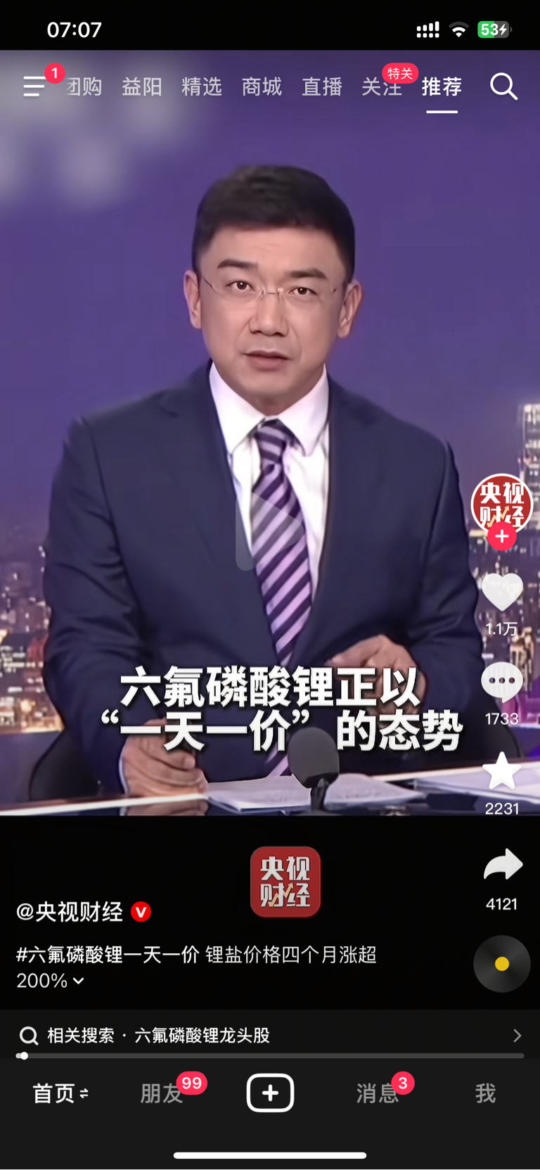 $天际股份(SZ002759)$ 兄弟们,上央视了,六氟磷酸锂价格持续走高,并且将继续走高,价格低迷时期大部分企业都没有持续投资,行业高度集中,有望继续走高