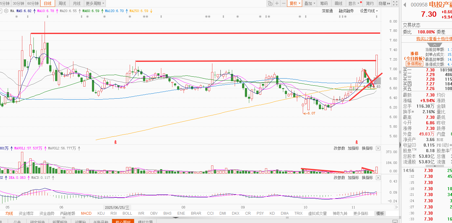 步步高,10月份CPI得到好转,在十五五规划预期提升后,消费的预期大概率是不会差。在连续缩量调整后,上周量能出现明显放大,周四更是直接给到涨停反包突破,这可视为是调整结束信号。虽上周五收出放量冲高回落,但在来到前期高位时出现如此情况,暂时可视为在释放前期高位压力和清洗跟风盘。问题不大。