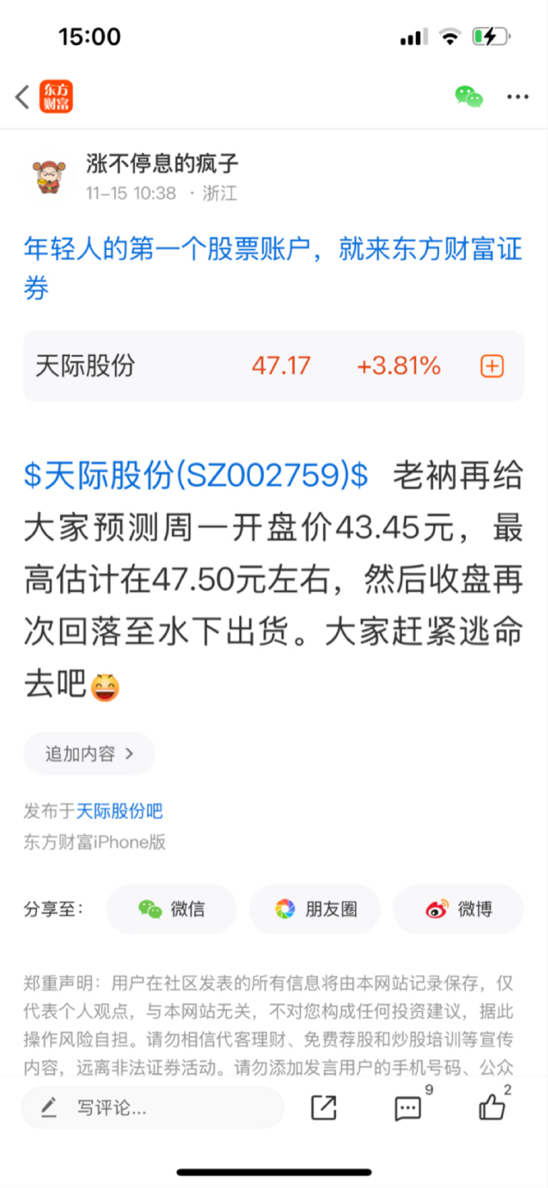 $天际股份(SZ002759)$ 老衲是不是提前告诉你们今天最高47.5元
