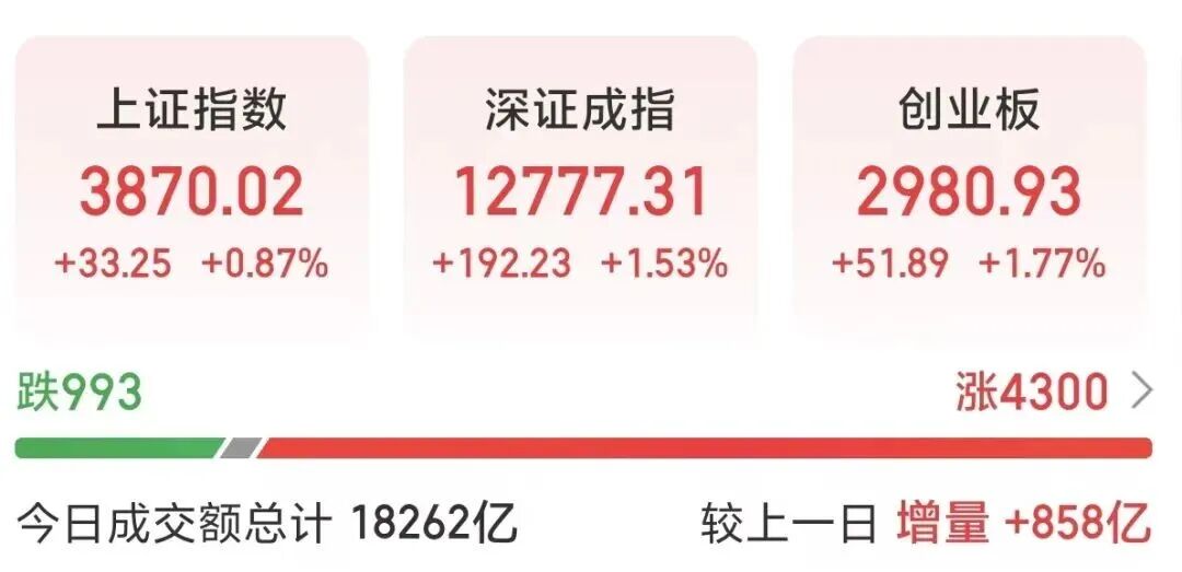 今日午后,A股三大指数高位震荡。截至收盘,上证指数涨0.87%,深证成指涨1.53%,创业板指涨1.77%。全市场4300只个股上涨,成交额超1.82万亿元。
