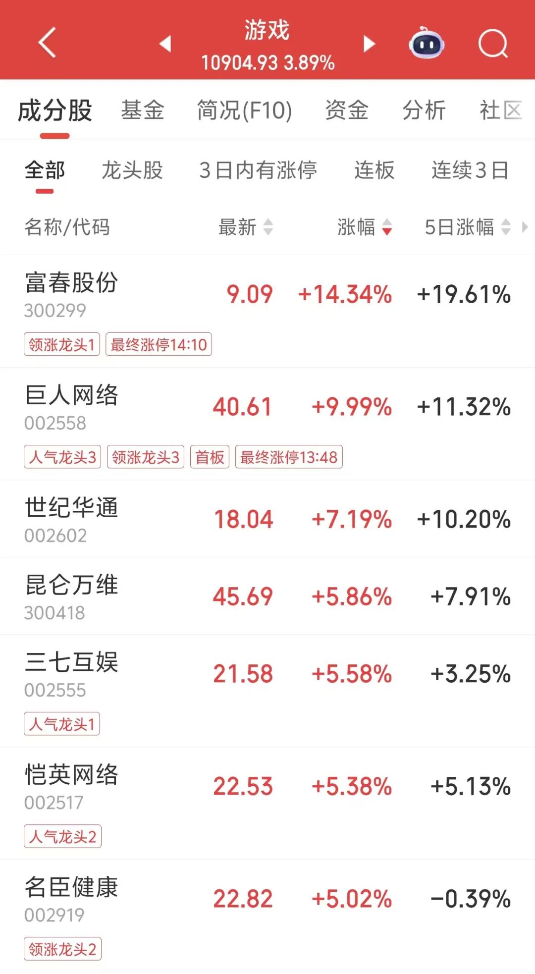 今日午后,游戏板块表现强势,富春股份盘中“20CM”涨停,收盘涨超14%,巨人网络涨停。