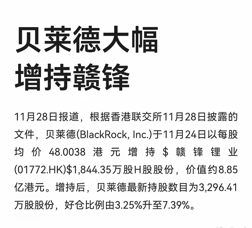 $天际股份(SZ002759)$ 贝莱德大幅增持赣锋