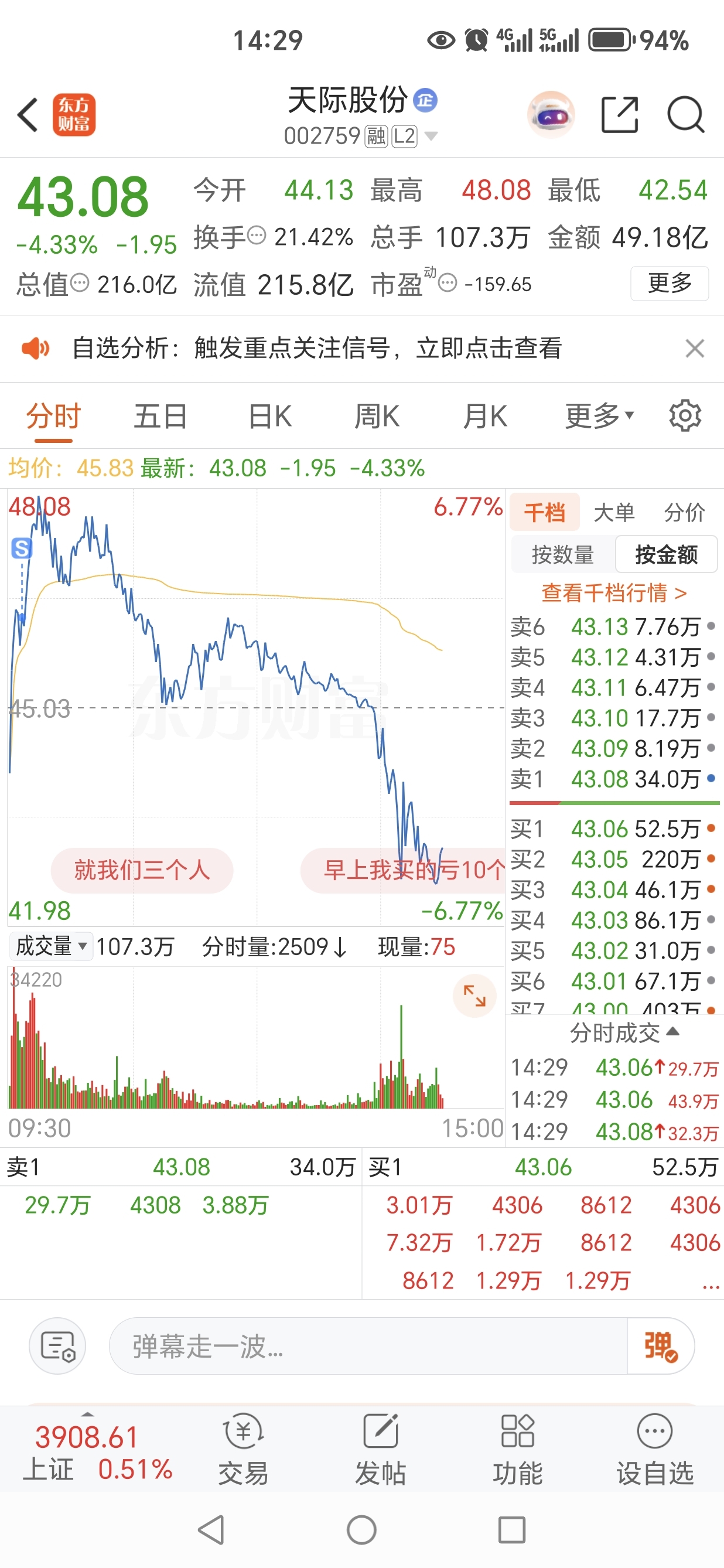 $天际股份(SZ002759)$ 卧槽这货跳水真牛逼,不跑芭比Q了