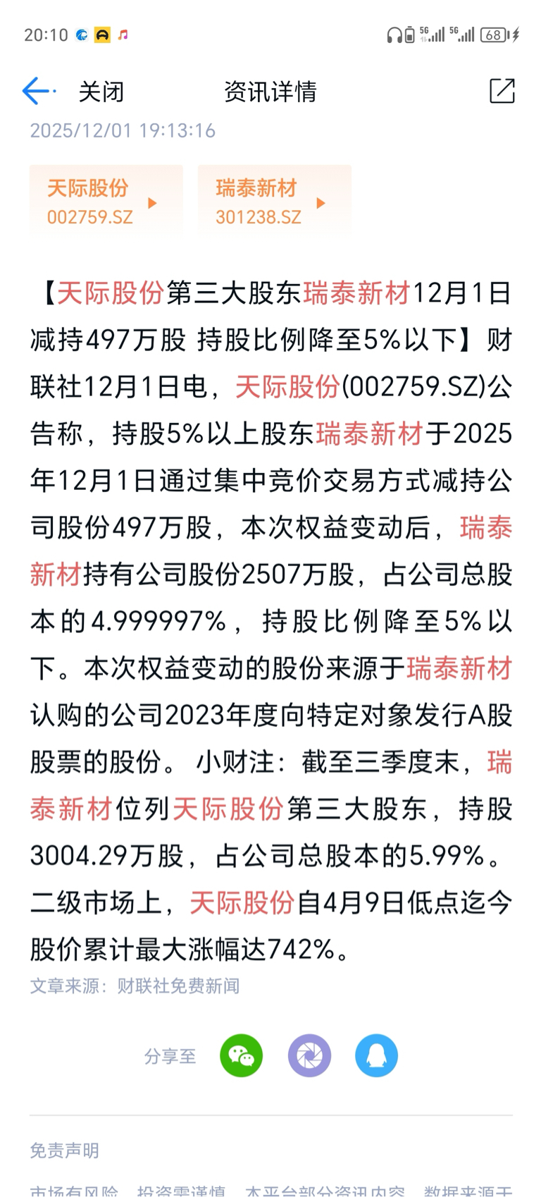 课代表来了,现在泰瑞还有4.999%股份,降到5%以内就是为轻仓清仓做准备,可以不发公告减持了,天际股份整个12月都危险,来多氟多或者天赐吧