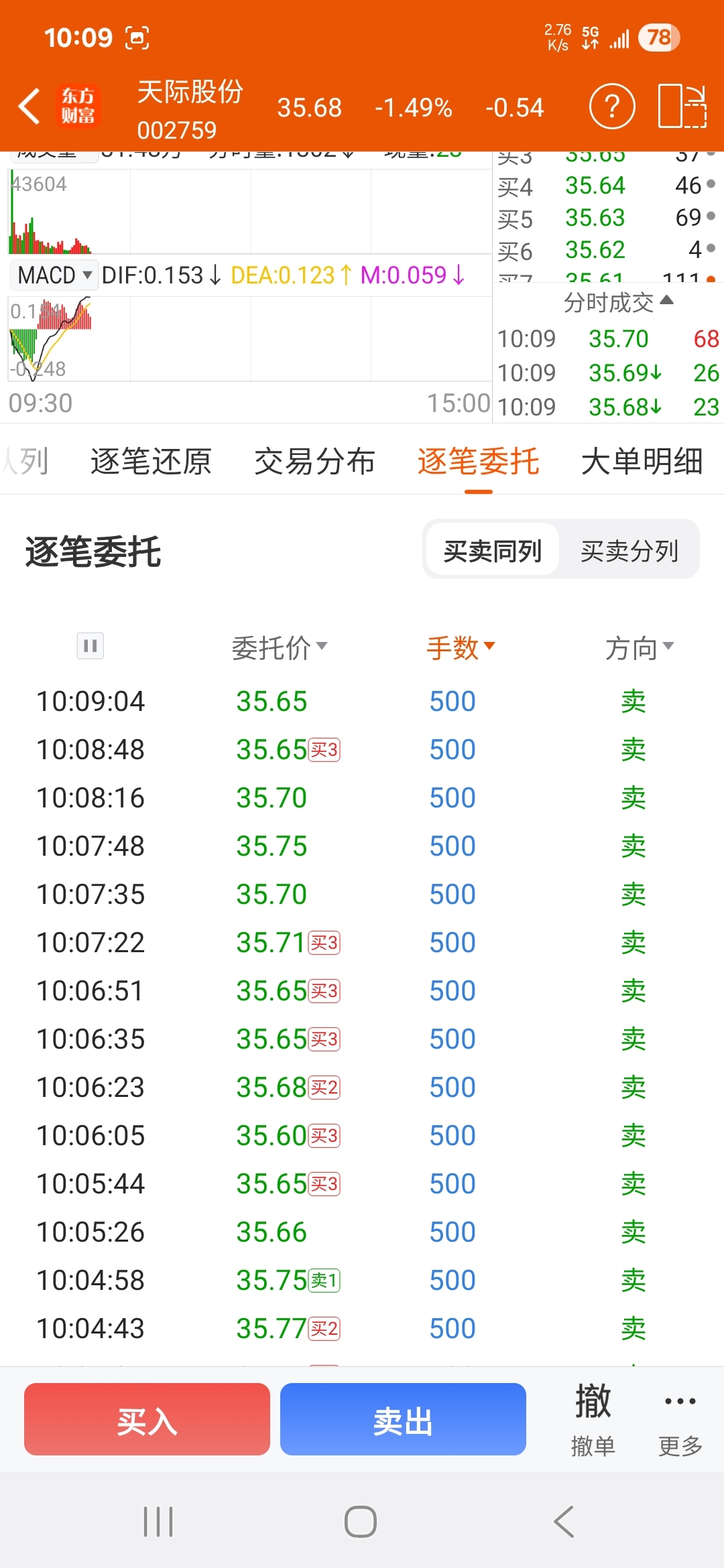 大股东还在减持,怕你了,35.68亏了几个点割了,500手的就是大股东的卖单,5
