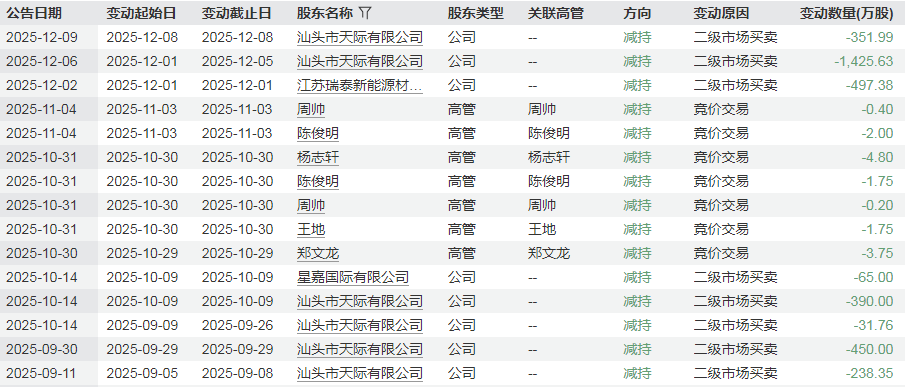 根据公告,12月1日至12月5日,汕头天际通过集中竞价方式减持天际股份1425.63万股,减持比例为2.84%;12月8日,汕头天际再次通过集中竞价方式减351.99万股,减持比例为0.7%。