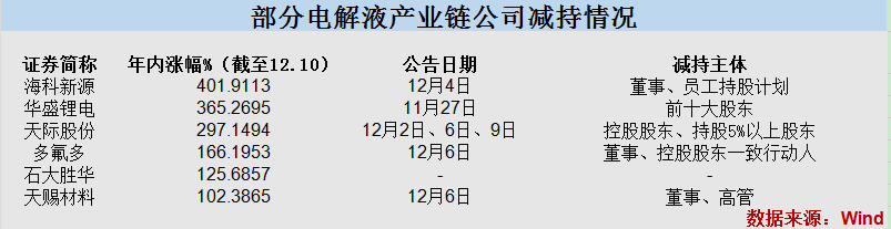 截至12月10日,纳入Wind电解液板块的11家上市公司中,有6家公司年内涨幅超过100%,其中除了地方国企石大胜华以外,其余公司11月以来均发布了股份减持计划。