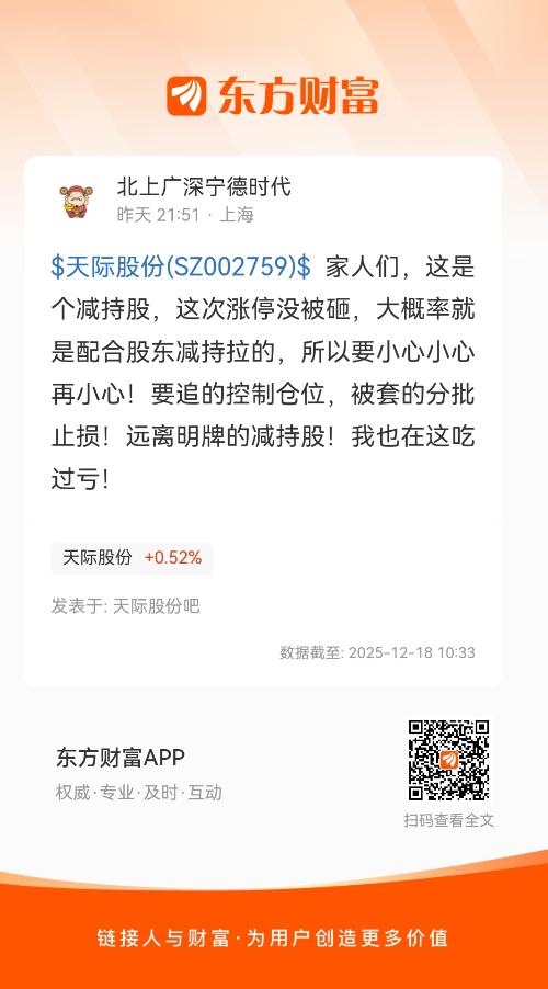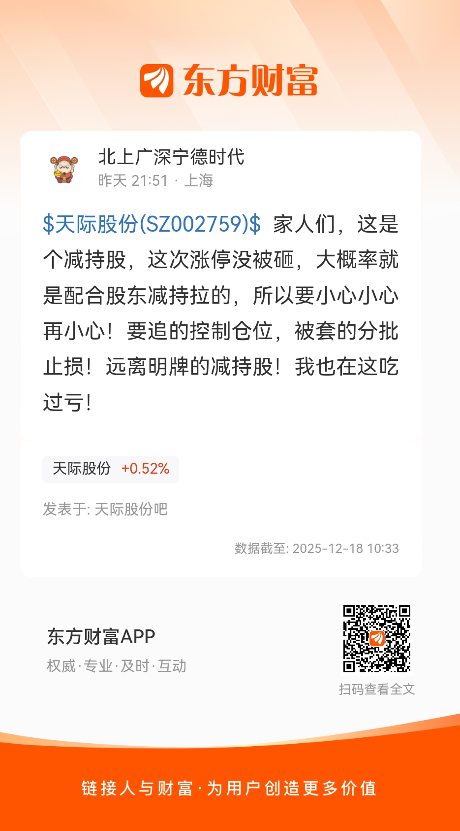 $天际股份(SZ002759)$ 家人们,这是个减持股,这次涨停没被砸,大概率就是配合股东减持拉的,所以要小心小心再小心!要追的控制仓位,被套的分批止损!远离明牌的减持股!我也在这吃过亏!