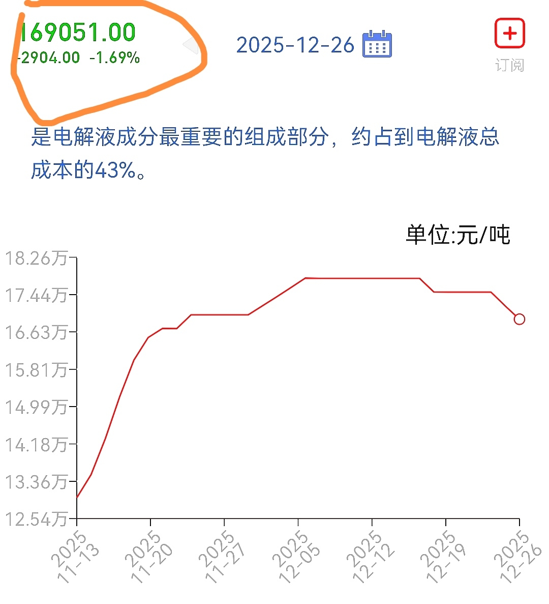 $天际股份(SZ002759)$ 六氟磷酸锂,价格顶点是17800元/吨。12月26日一天,现货价格下跌2904元/吨,跌至169051元/吨,跌幅-1.69%。下周一,4天3板的天际股份,会不会承压?
