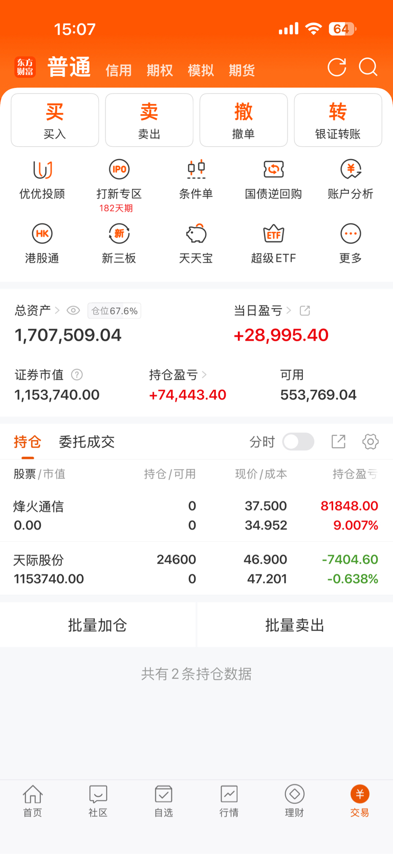 今天又是航天的表演秀,烽火今天盘中有很大抛压,不过一直在红盘还是挺好的,午后有超大单压盘还是突破上去了,最终38的位置全部清仓落袋为安了。随后指数跳水,感觉航天今天有高潮的意思,尾盘再次接回我的老朋友天际股份,今天虽跌破10日线,明天抛压预计会变少,等个反弹空间再走。$天际股份(SZ002759)$ $烽火通信(SH600498)$