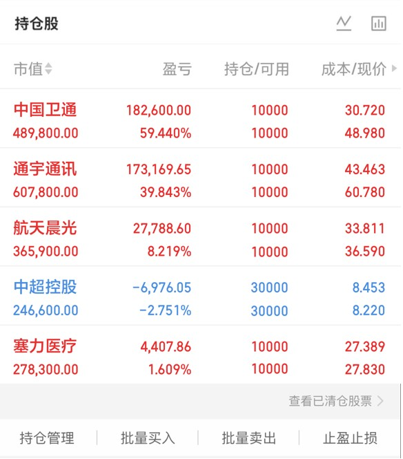 $中国卫通(SH601698)$上周五是缩量涨停,主力资金净流入超4 Y,而且主力金额成交占比高,形成高度高度控盘的局面了,短期走势也不难预测,只要没有散户进来,就有可能继续拉高。不过卫通作为国内唯一拥有自主可控广域静止轨道卫星资源的运营商。这种护城河是拥有无限想象空间的。航天火箭题材消息的不断发酵,市值也不断重新估值,卫通经过上周五的缩量上涨。真是说明是当下政策与资金抱团的核心标的。今日很可能直接高开高走。不破5日线根本不用慌的。