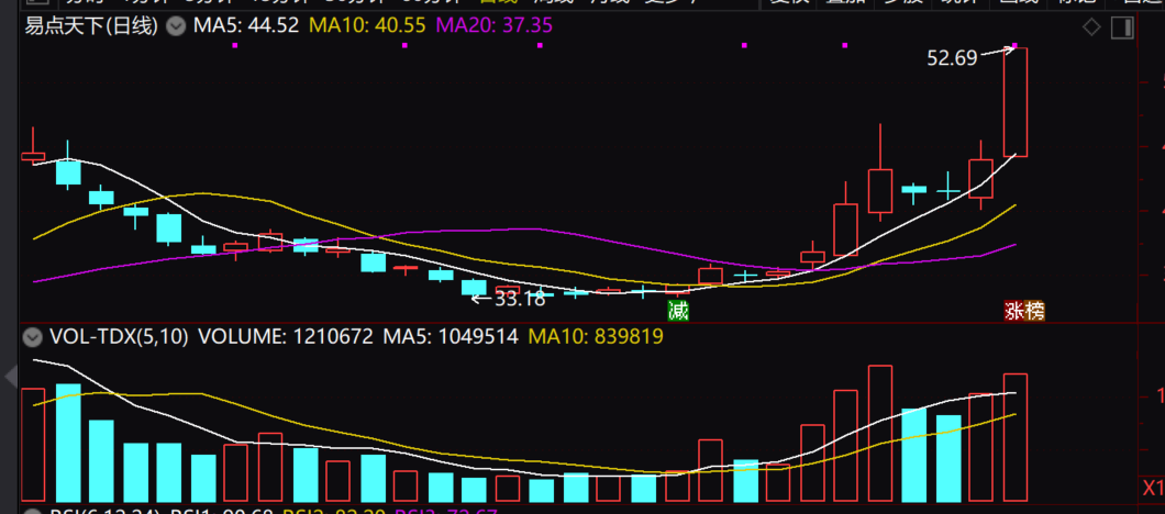 易点天下基本面上,前三三季度净利润近2 Y,同比小幅增加,技术面上目前是呈现量价齐升的健康状态,均线呈现多头排列,上周放量2 0 C M涨停,价格创历史新高,AI应用板块辨识度直接拉满。今日如果能够低开,或者高开后继续向下回调企稳,就要尝试会一会了。