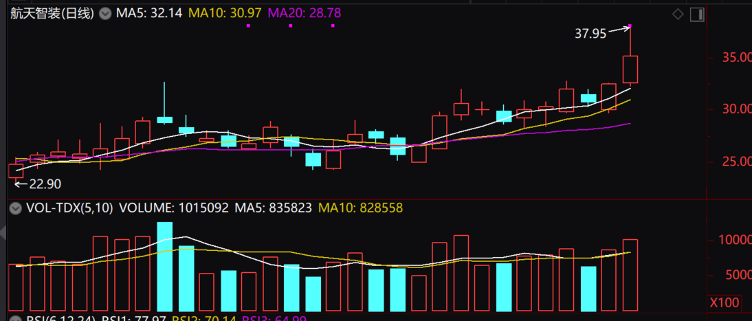 航天智装周末有传来申请超20 W颗卫轨道资源的消息。除了卫星,航电等被受关注外,航天智装作为航天五院智能装备上市平台,提供宇航级芯片、智能测试仿真系统、微系统及控制部组件。也会受到资金的青睐而且公司的轨道交通和核工业领域业务还涉及有机器人相关产品。基本较弱。前三季度,营收近7 Y,但净利润为负,同比大幅减少。技术面上,量价齐升的,均线呈现多头排列向上。上周五回踩5日线后涨近8%,短期无涨停,但是趋势呈现沿着10日线走趋势,因此短期有可能走加速。今日如果能够回调到5日线附近企稳或者,盘中分时图放量走强就介入一波.