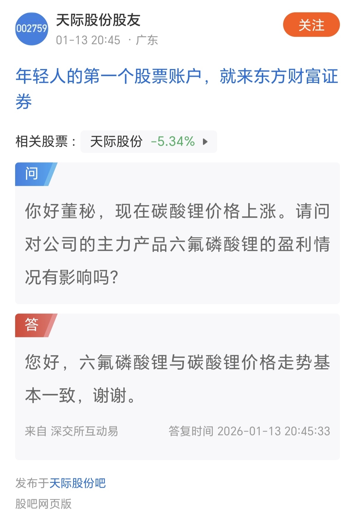 想想也是会同步上涨,哪有原料碳酸锂涨,产品六氟磷酸锂不涨的道理,但最近天际的股价