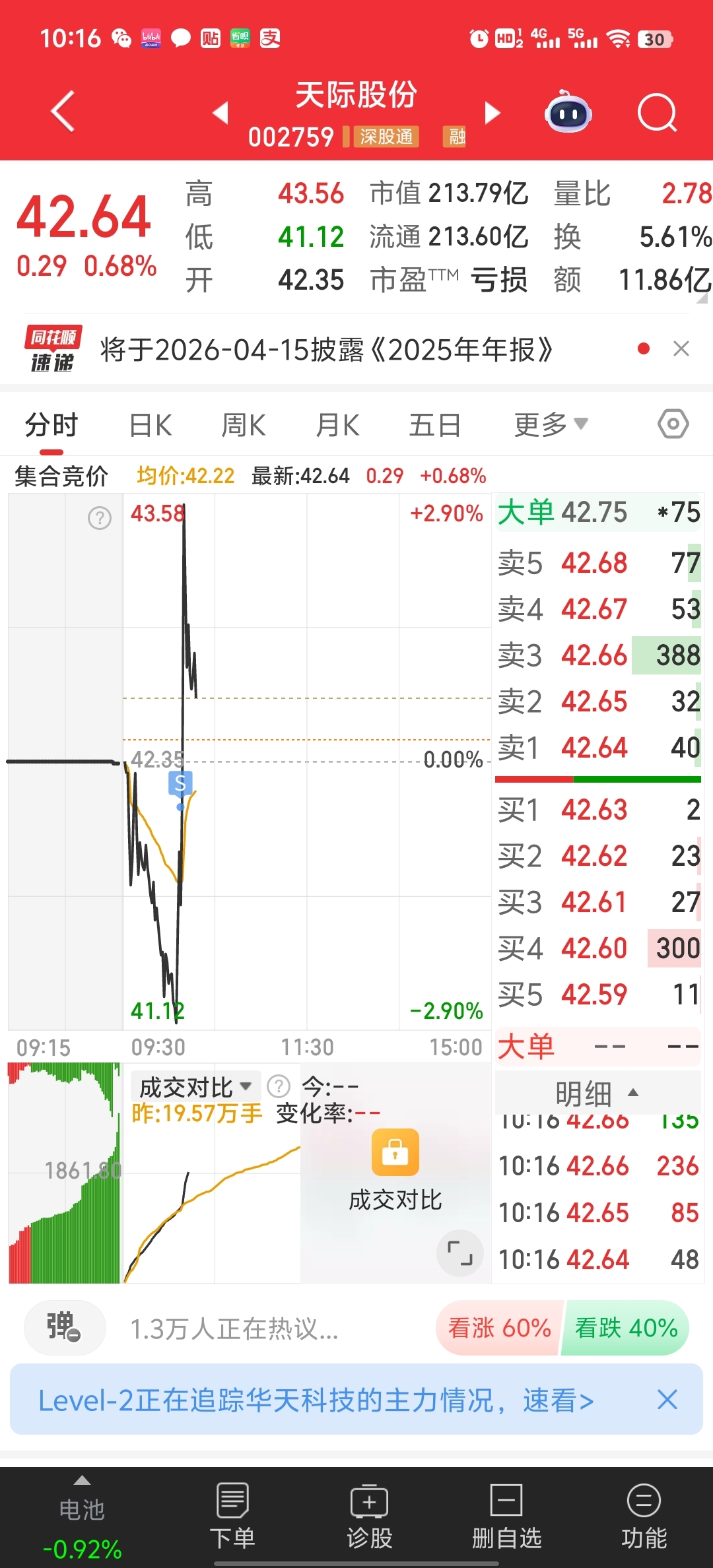 $天际股份(SZ002759)$ 看拉升没大单,就卖了,刚卖真的就1秒都没有大单就来了,这卖飞真的是服了