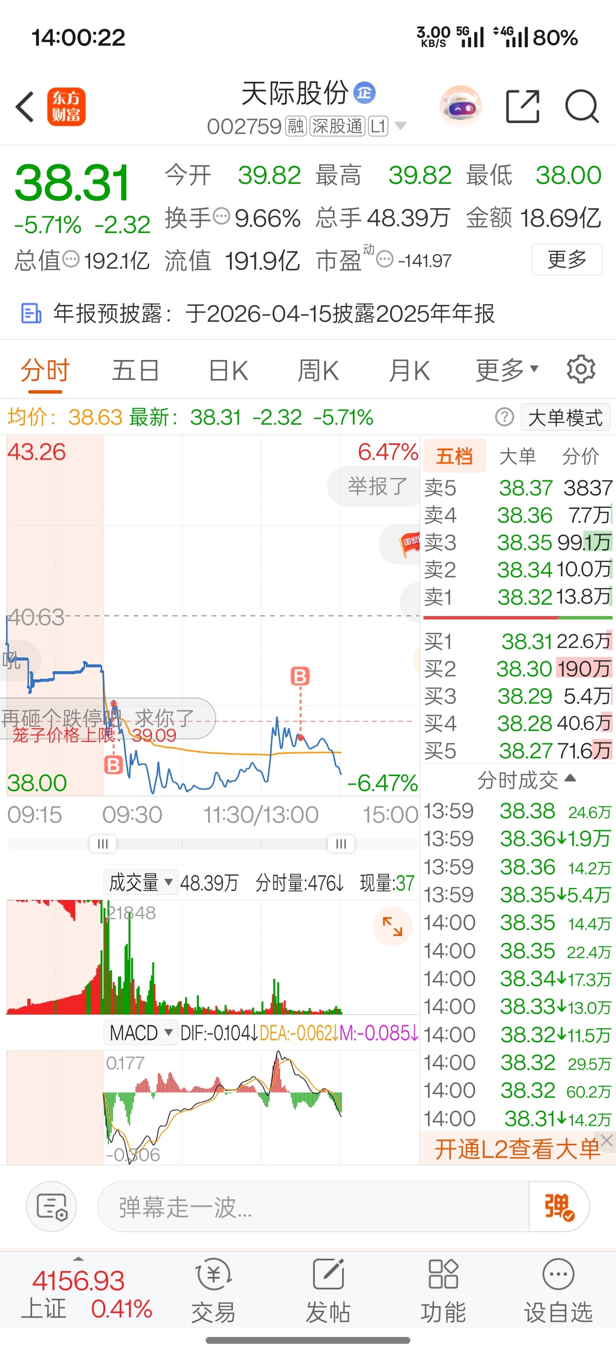 $天际股份(SZ002759)$ 再砸个跌停吧 求你了