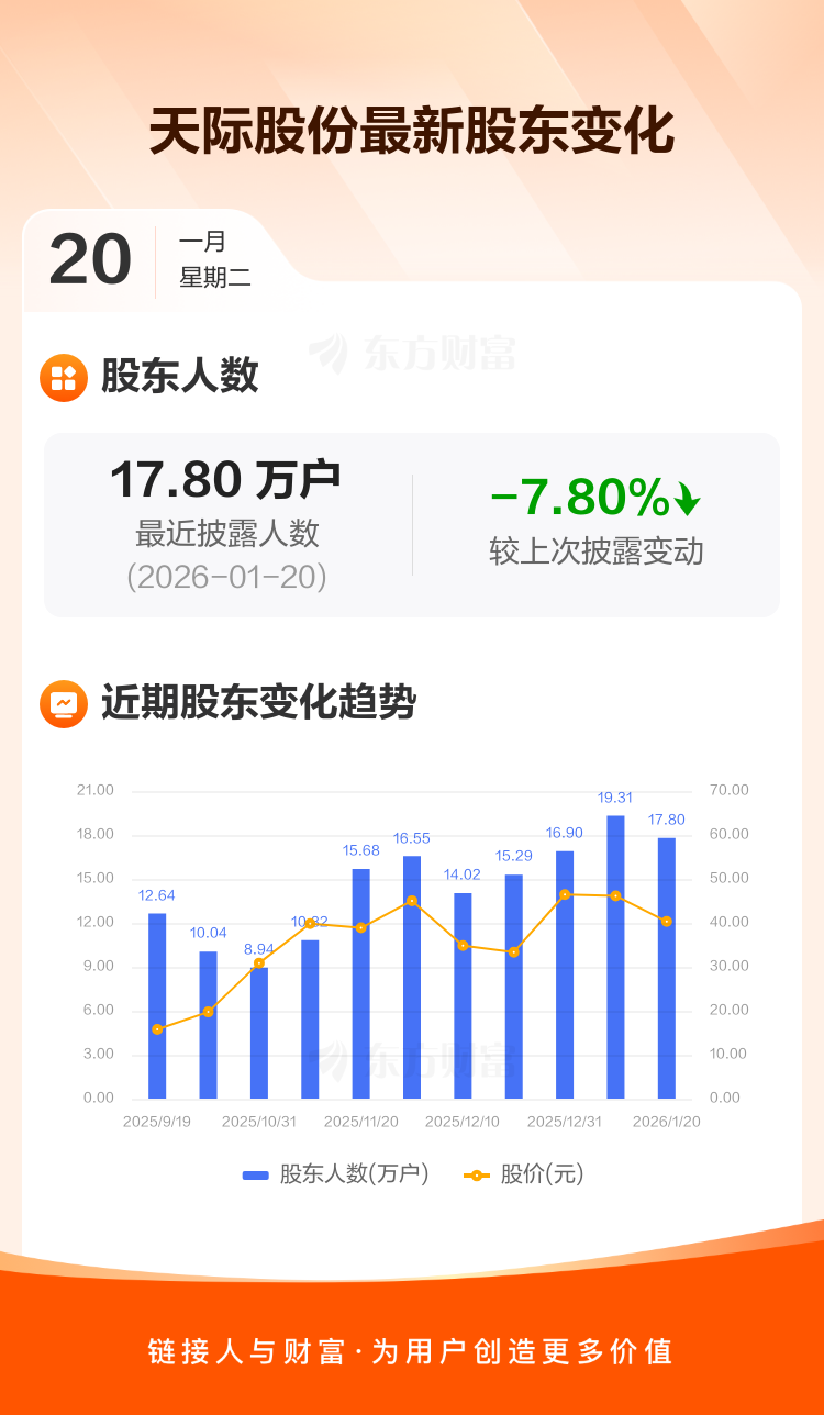 天际股份:截至1月20日最新股东户数17.80万户,较上期减少7.80%