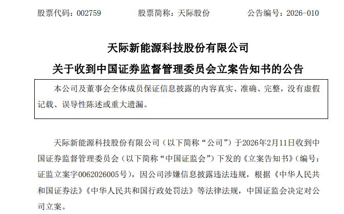 2月11日晚,天际股份(002759.SZ,股价43.96元,市值220.41亿元)公告称,因公司涉嫌信息披露违法违规,中国证券监督管理委员会决定对公司立案。目前公司各项生产经营活动正常,立案调查不会对公司正常生产经营产生重大影响。公司将积极配合中国证监会的工作,并严格履行信息披露义务。