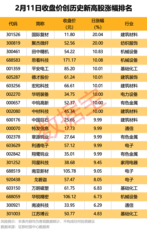 收盘价创历史新高股今日股价平均上涨5.43%,其中涨停的有国际复材、聚杰微纤、宏和科技等,涨幅居前的有田中精机、思看科技、同星科技等。