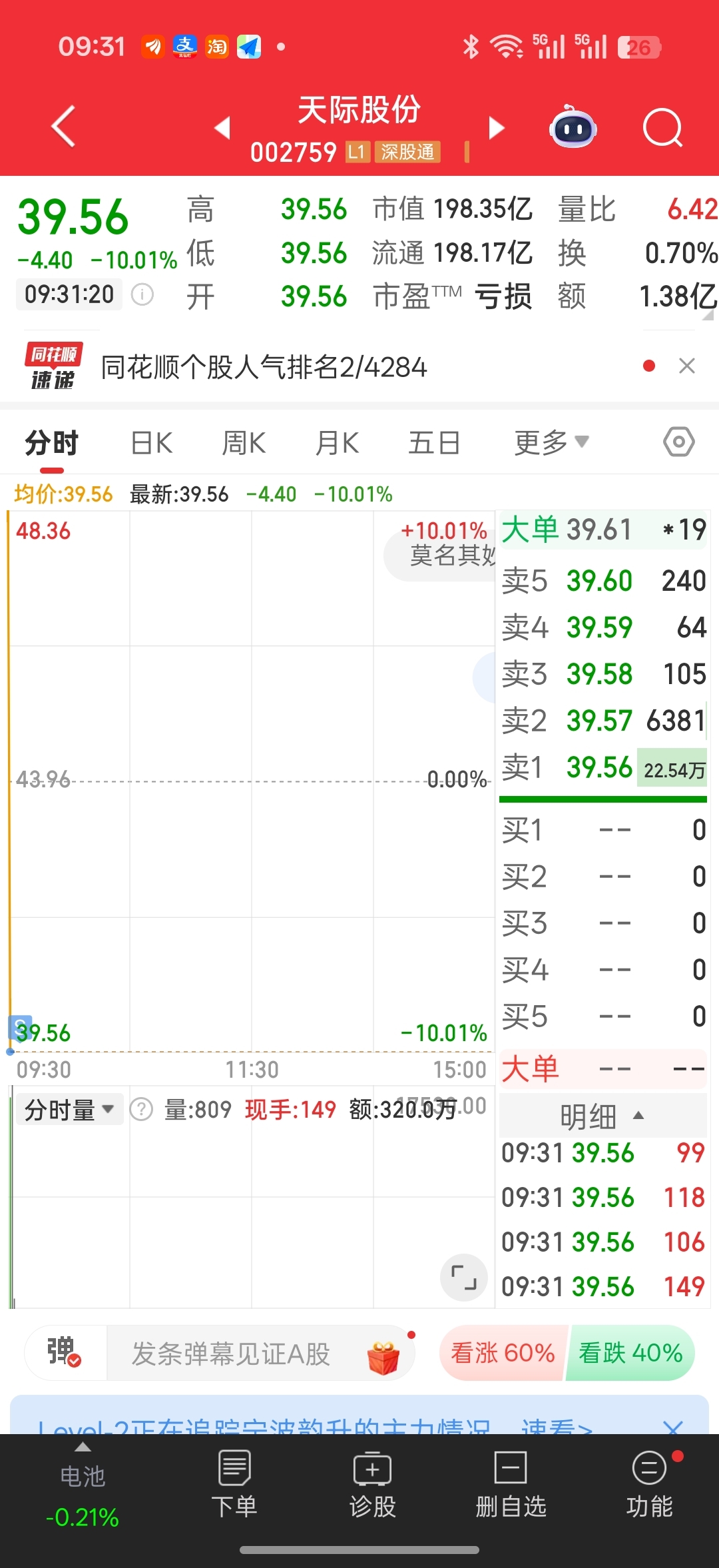 $天际股份(SZ002759)$ 昨天进的6cm浮盈今天被ex坏了,昨夜八点挂的单早上不抱幻想开盘走了