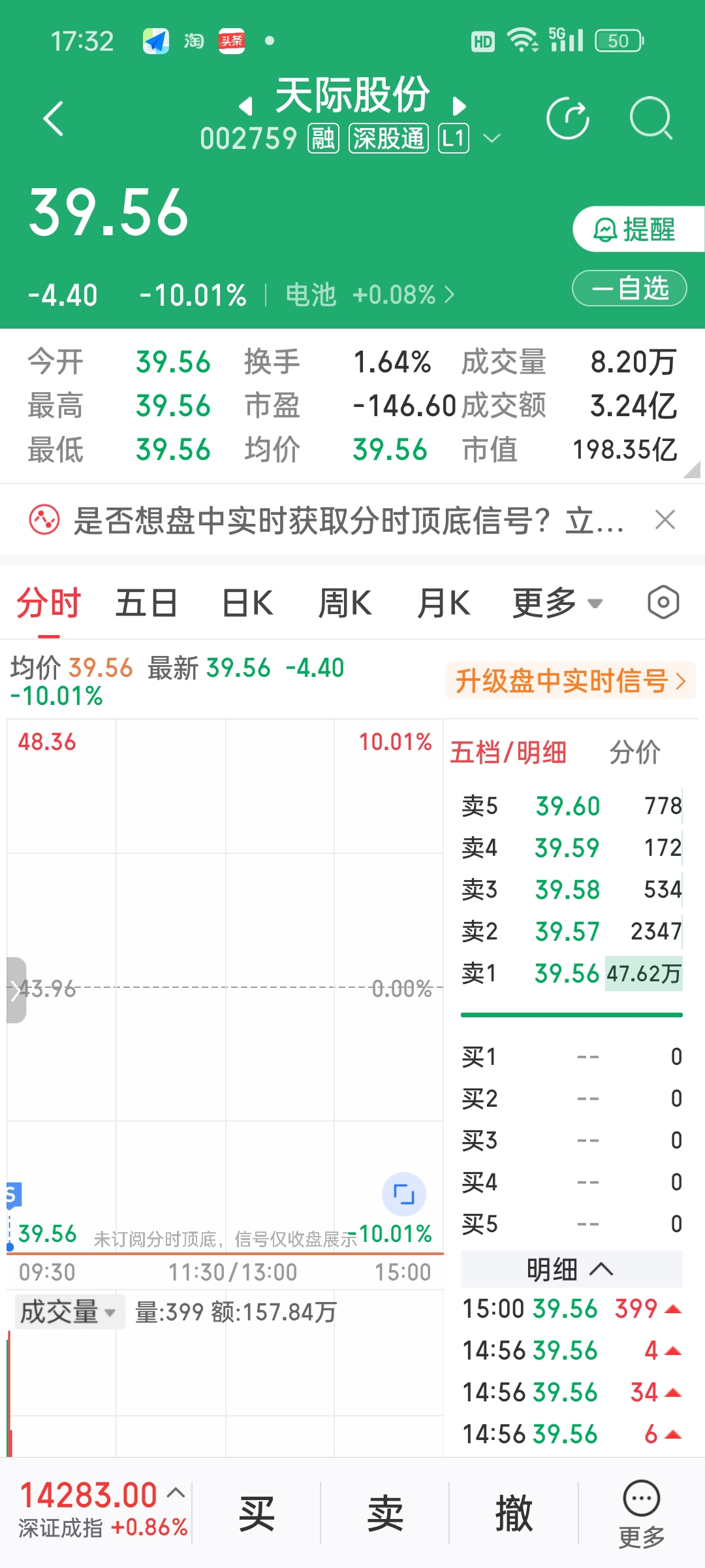 $天际股份(SZ002759)$ 昨天晚上挂的单今天早上少亏了点先出来了,这是不幸中的万幸,希望明天开板让散户少亏点出来