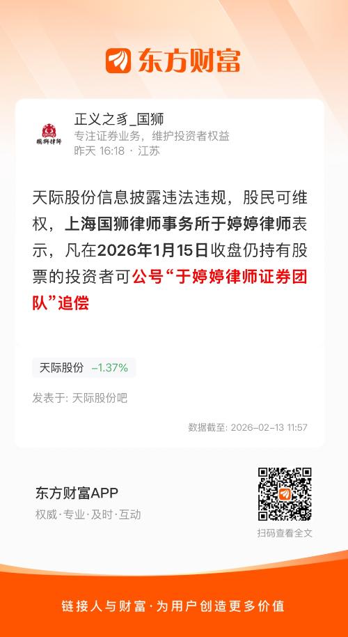 天际股份信息披露违法违规,股民可维权,上海国狮律师事务所于婷婷律师表示,凡在2026年1月15日收盘仍持有股票的投资者可公号“于婷婷律师证券团队”追偿