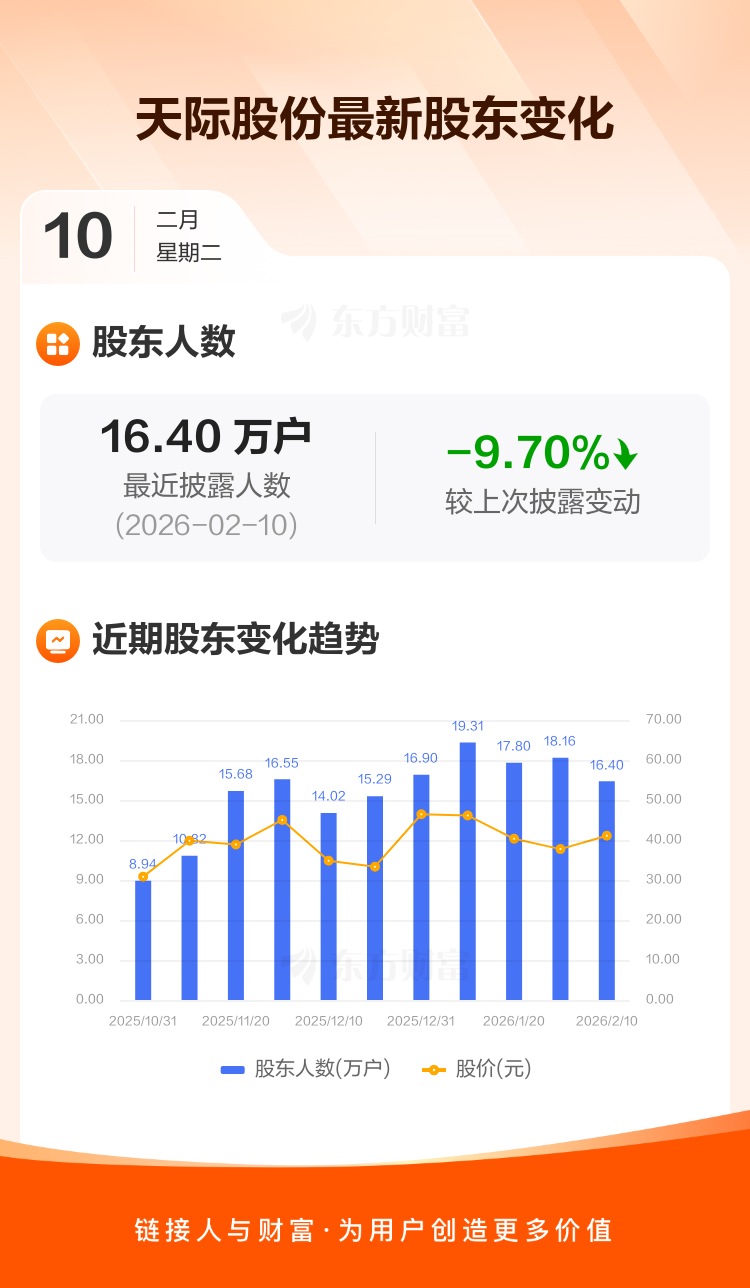 天际股份:截至2月10日最新股东户数16.40万户,较上期减少9.70%