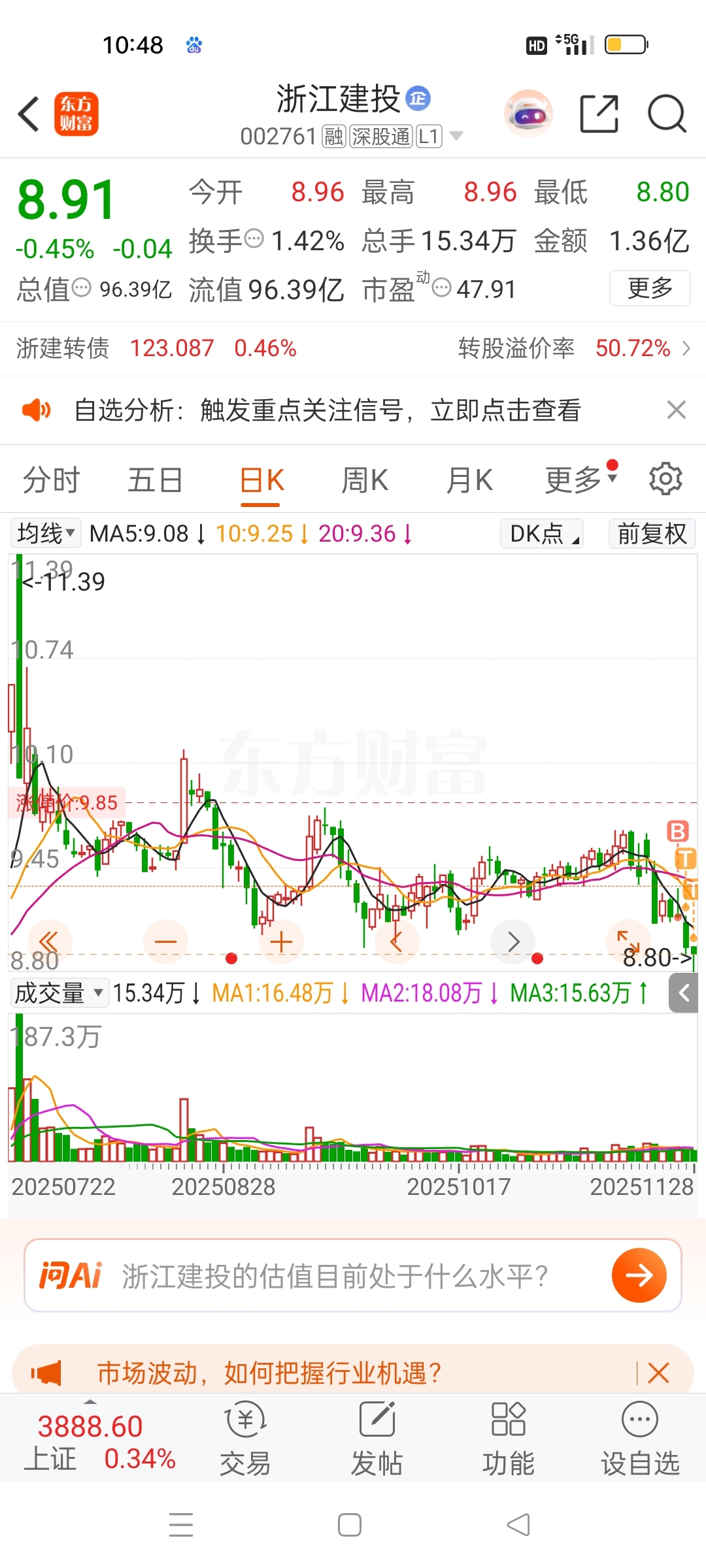 $浙江建投(SZ002761)$ 一买就跌也不知出什么鬼。刚清了洋河,想在持股播一下反弹的。C。大A真不能玩。买哪哪跌。