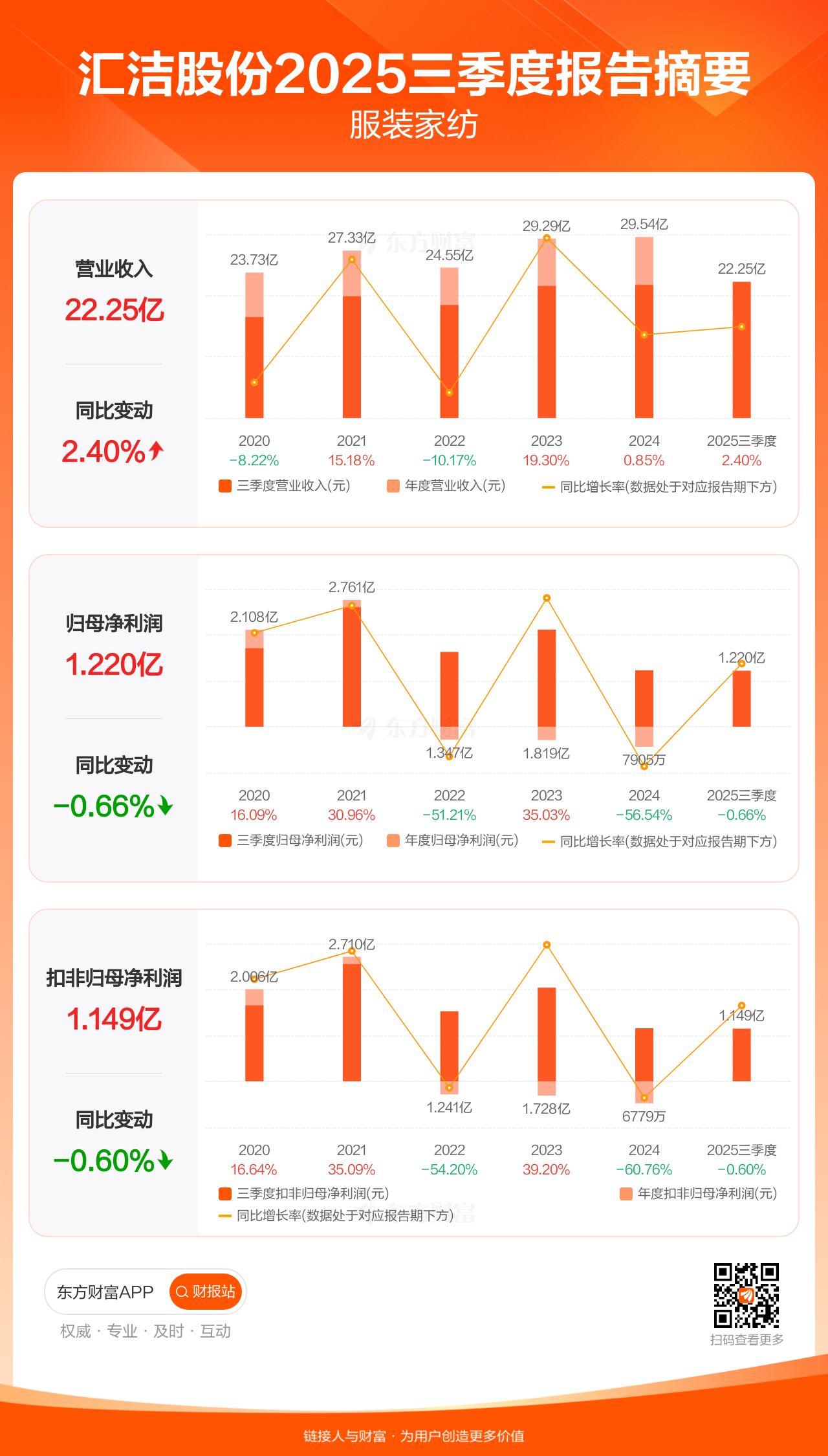 汇洁股份10月30日发布2025年三季报显示,公司前三季实现营业收入22.25亿元,同比增长2.40%;归母净利润1.22亿元,同比下滑0.66%;扣非归母净利润1.15亿元,同比下滑0.60%。