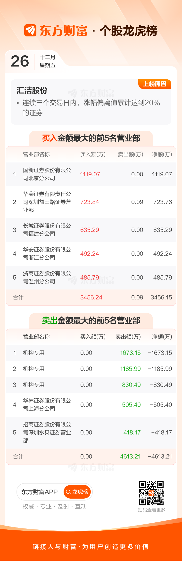 交易所2025年12月26日公布的交易公开信息显示,汇洁股份因成为连续三个交易日内,涨幅偏离值累计达到20%的证券上榜。汇洁股份当日收报8.68元,涨跌幅10.01%,换手率1.75%,成交额4606.23万。异常期间12月25日至12月26日,期间涨幅21.06%,累计偏离值20.11%,区间成交额1.29亿。
