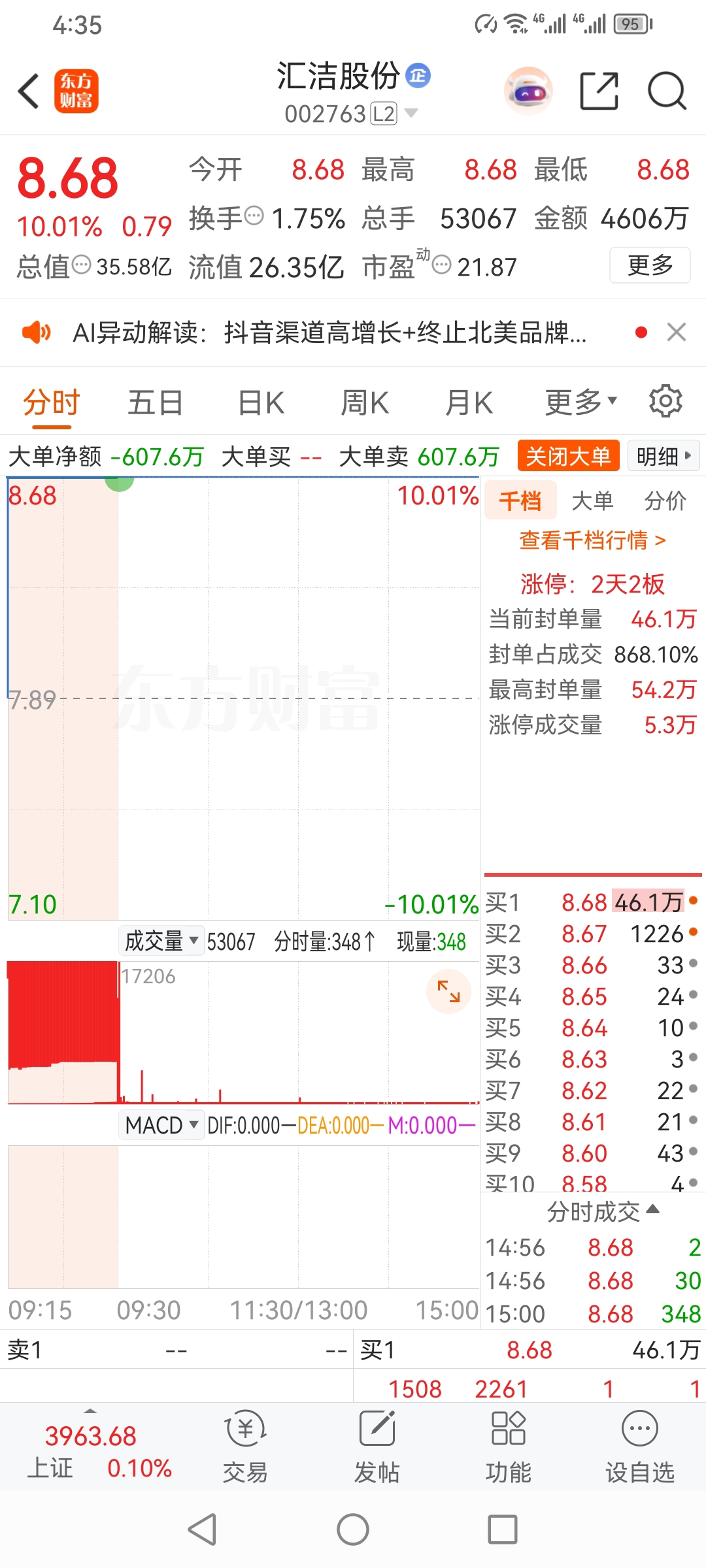 @妙想@炒股冠军军哥@炒股冠军方军汇洁股份,军哥游资股票,集合竞价分析,主力,涨