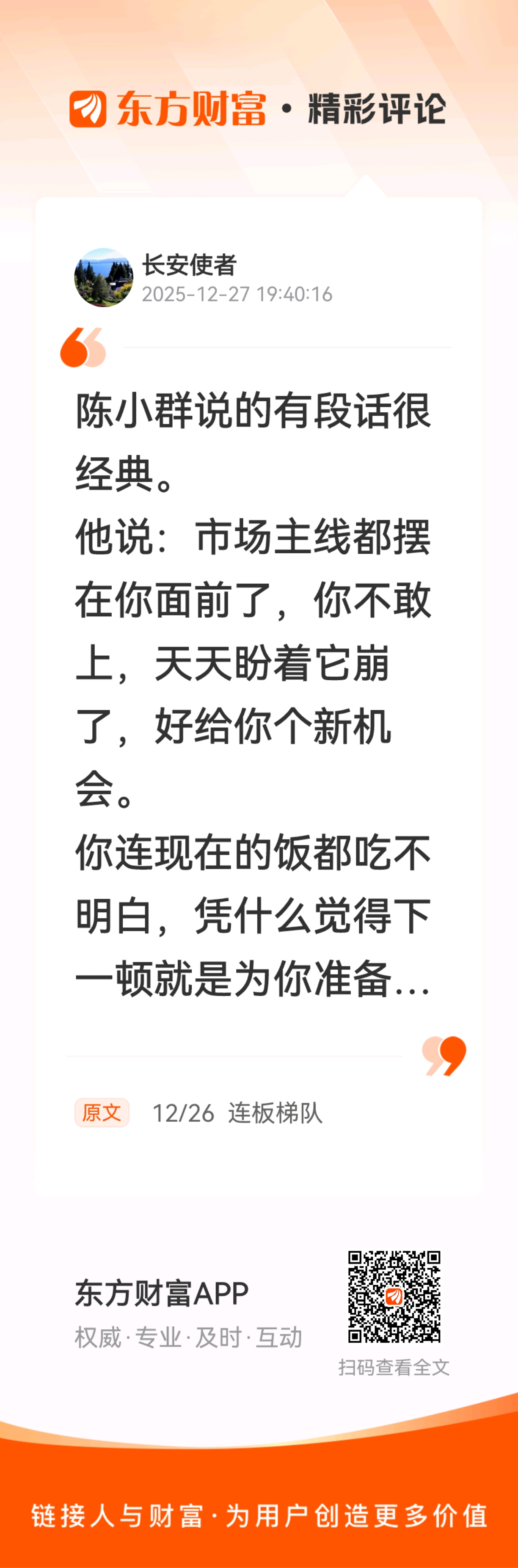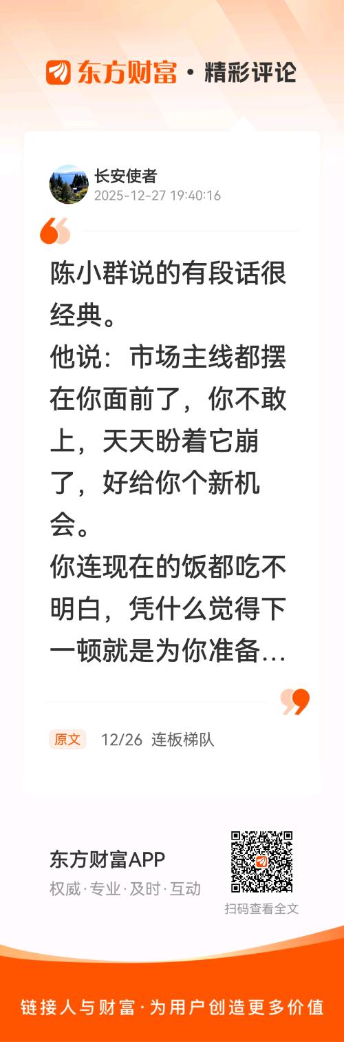 //@长安使者 :陈小群说的有段话很经典。他说:市场主线都摆在你面前了,你不敢上,天天盼着它崩了,好给你个新机会。你连现在的饭都吃不明白,凭什么觉得下一顿就是为你准备的满汉全席?主线是市场用真金白银砸出来的共识,是确定性最高的地方。如果你连当下最清晰、最赚钱的机会都把握不住,那么你去赌未来的“未知机会”,胜算其实更低。这是为什么我们始终要围绕着商业航天找机会的原因。事实上回头看,如果能像群总那样坚定的拿着商业航天的核心标的,股票也就变得很简单了。但是绝大多数散户既恐高又贪婪,还爱幻想,是一个矛盾的综合体。恐高,看到股票涨多了就不敢买,总想等调整到位抄底,结果眼睁睁看着主线龙头一骑绝尘。贪婪,一个主线在主升,就想着自己能预测下一个新主线。幻想,一个主线彻底退潮走弱了,却又幻想再来一波。最终导致的结果,就是涨也怕,跌也怕,始终陷入到负反馈的循环中。