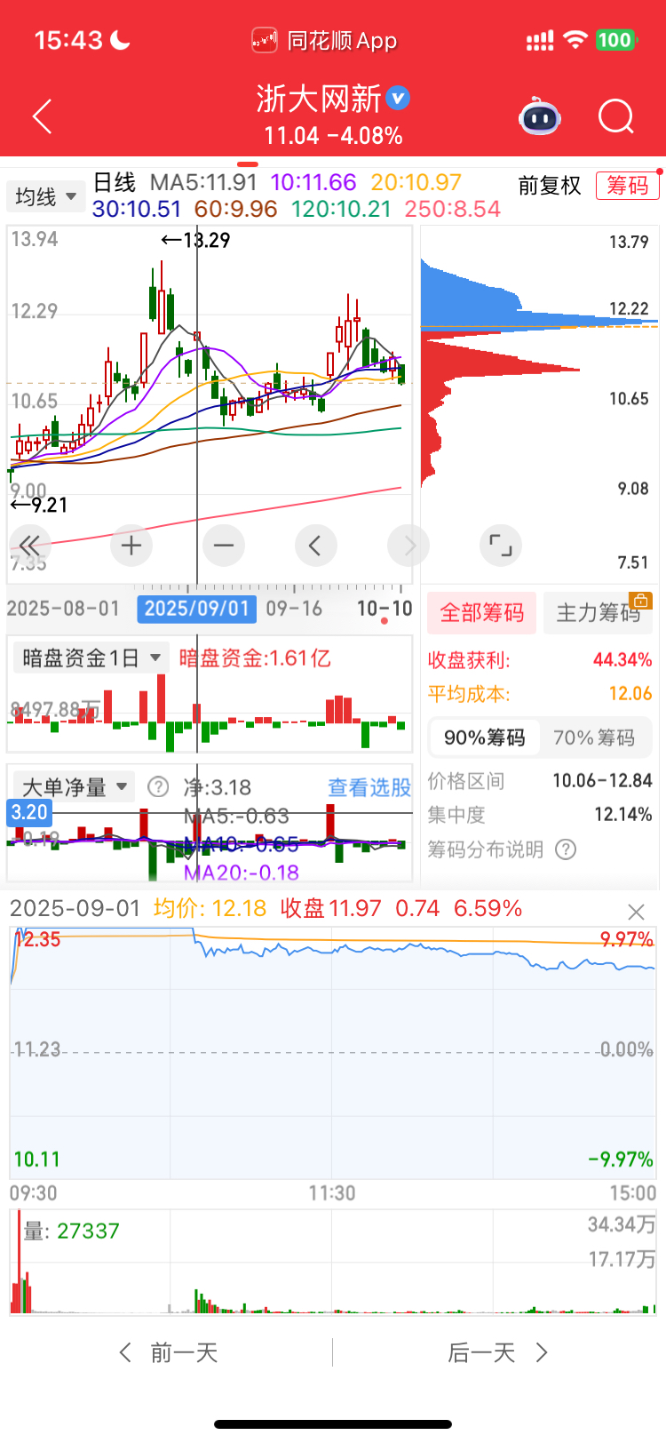 和浙大网新9月1日走势高度吻合,浙大网新也是和蓝黛一样,前面一个涨停然后短期大幅回调,9月1日反抽封板后炸开,然后日内分时一路走低,日内明暗盘均大幅流入,9月2日开始低开大跌,下周一估计蓝黛这货也一样走势,集合竞价就是最高点。