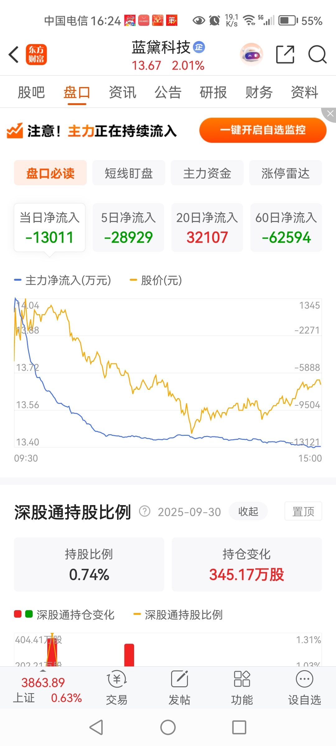 $蓝黛科技(SZ002765)$ 主力在跑路,根本涨不了,全天净跑出1.3亿,主力不让涨又有锤子的法呀
