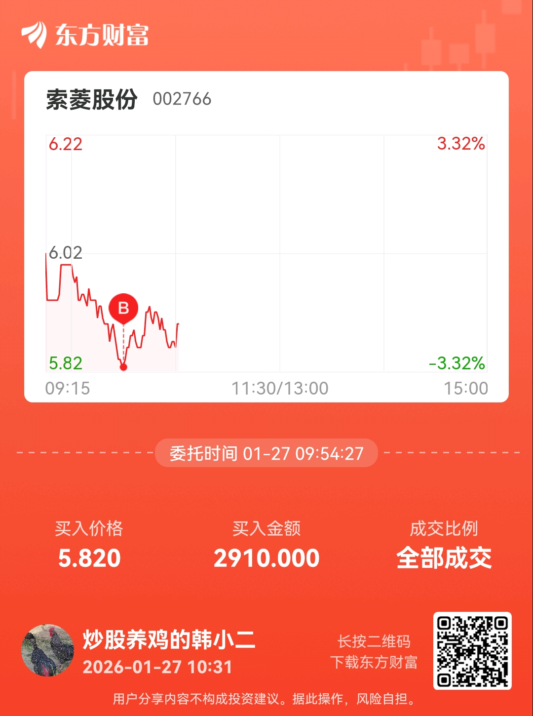 温馨提示: 1.根据《证券法》规定,禁止编造、传播虚假信息或者误导性信息,扰乱证券市场;2.用户在本社区发表的所有资料、言论等仅代表个人观点,与本网站立场无关,不对您构成任何投资建议。用户应基于自己的独立判断,自行决定证券投资并承担相应风险。《东方财富社区管理规定》