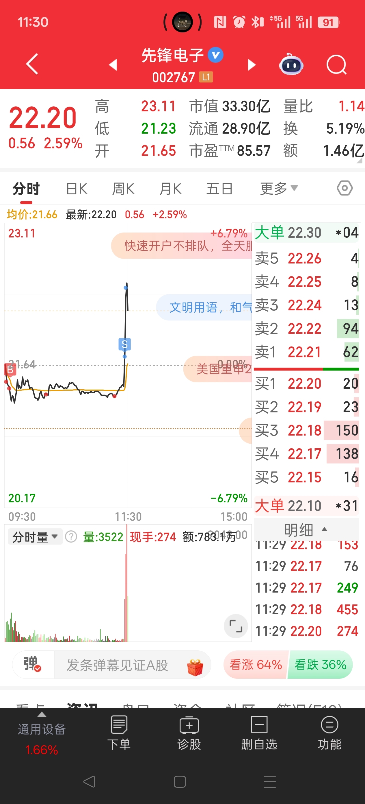 $先锋电子(SZ002767)$ 没有踢在高点,今天很遗憾。