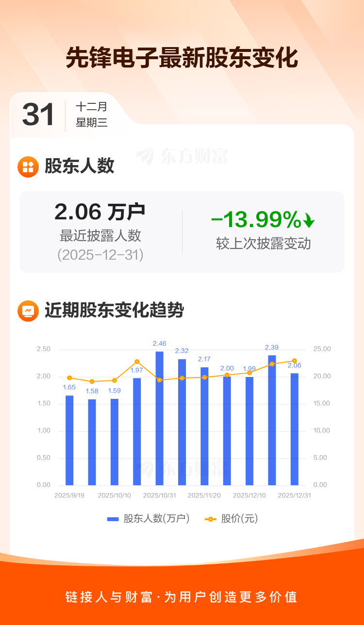 先锋电子最新披露数据显示,截至12月31日公司股东户数为2.06万户,较上期(2025年12月19日)减少3346户,降幅为13.99%。户均持有流通股数量由上期的5444股上升至6330股,户均持股金额由上期的12.14万元增加至14.50万元。