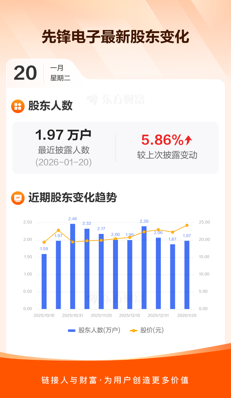 先锋电子最新披露数据显示,截至1月20日公司股东户数为1.97万户,较上期(2026年1月9日)增加1093户,增幅为5.86%。户均持有流通股数量由上期的6980股下降至6593股,户均持股金额由上期的15.50万元增加至15.94万元。