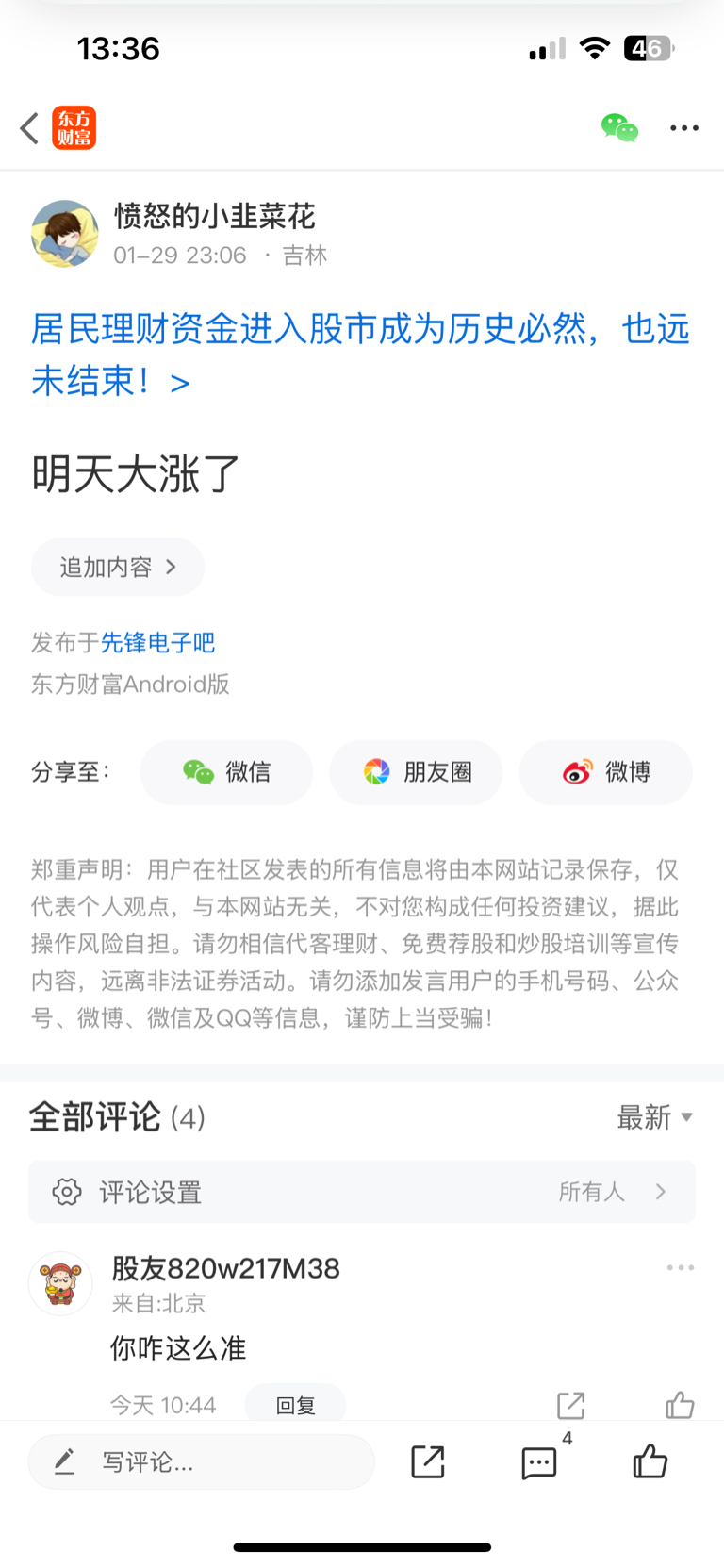 温馨提示: 1.根据《证券法》规定,禁止编造、传播虚假信息或者误导性信息,扰乱证券市场;2.用户在本社区发表的所有资料、言论等仅代表个人观点,与本网站立场无关,不对您构成任何投资建议。用户应基于自己的独立判断,自行决定证券投资并承担相应风险。《东方财富社区管理规定》