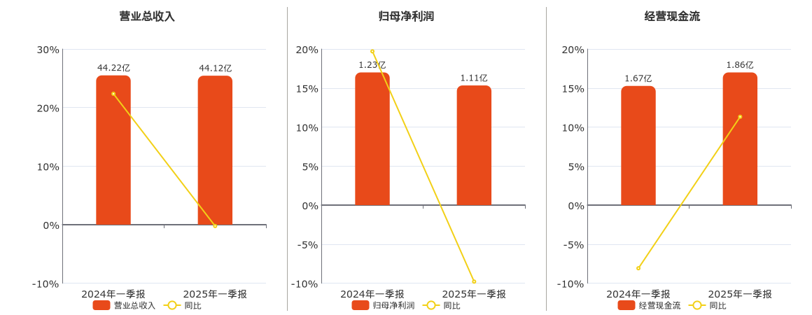 公司营业总收入为44.12亿元,较去年同报告期营业总收入减少1038.16万元,同比较去年同期下降0.23%。归母净利润为1.11亿元,较去年同报告期归母净利润减少1205.84万元,同比较去年同期下降9.79%。经营活动现金净流入为1.86亿元。