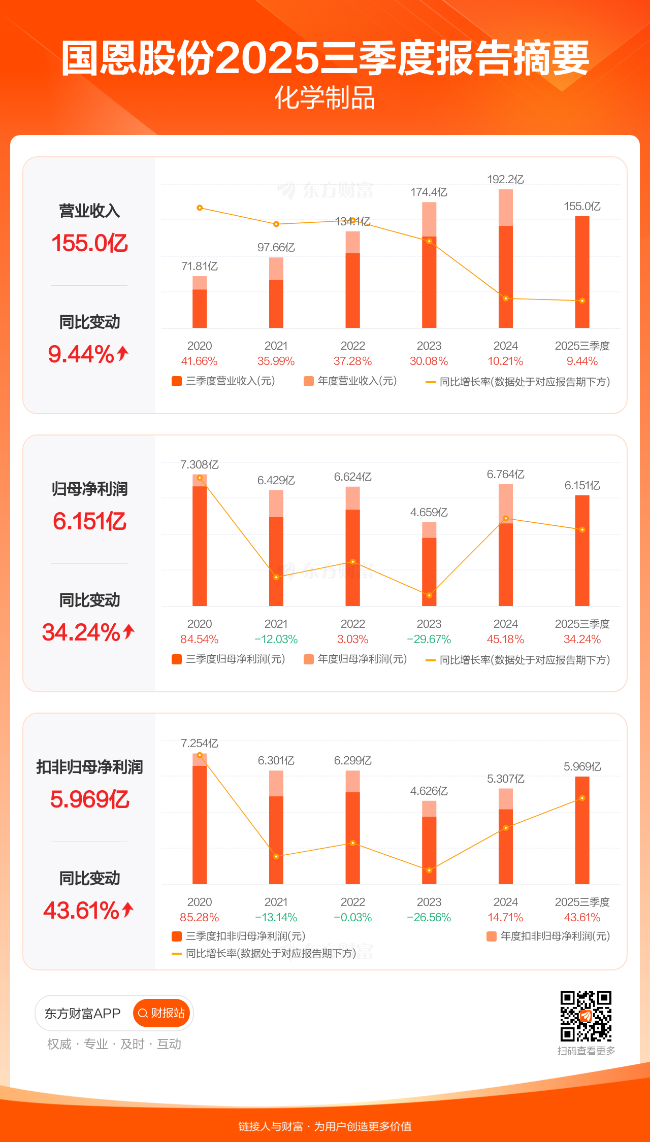 国恩股份10月29日发布2025年三季报显示,公司前三季实现营业收入154.97亿元,同比增长9.44%;归母净利润6.15亿元,同比增长34.24%;扣非归母净利润5.97亿元,同比增长43.61%。
