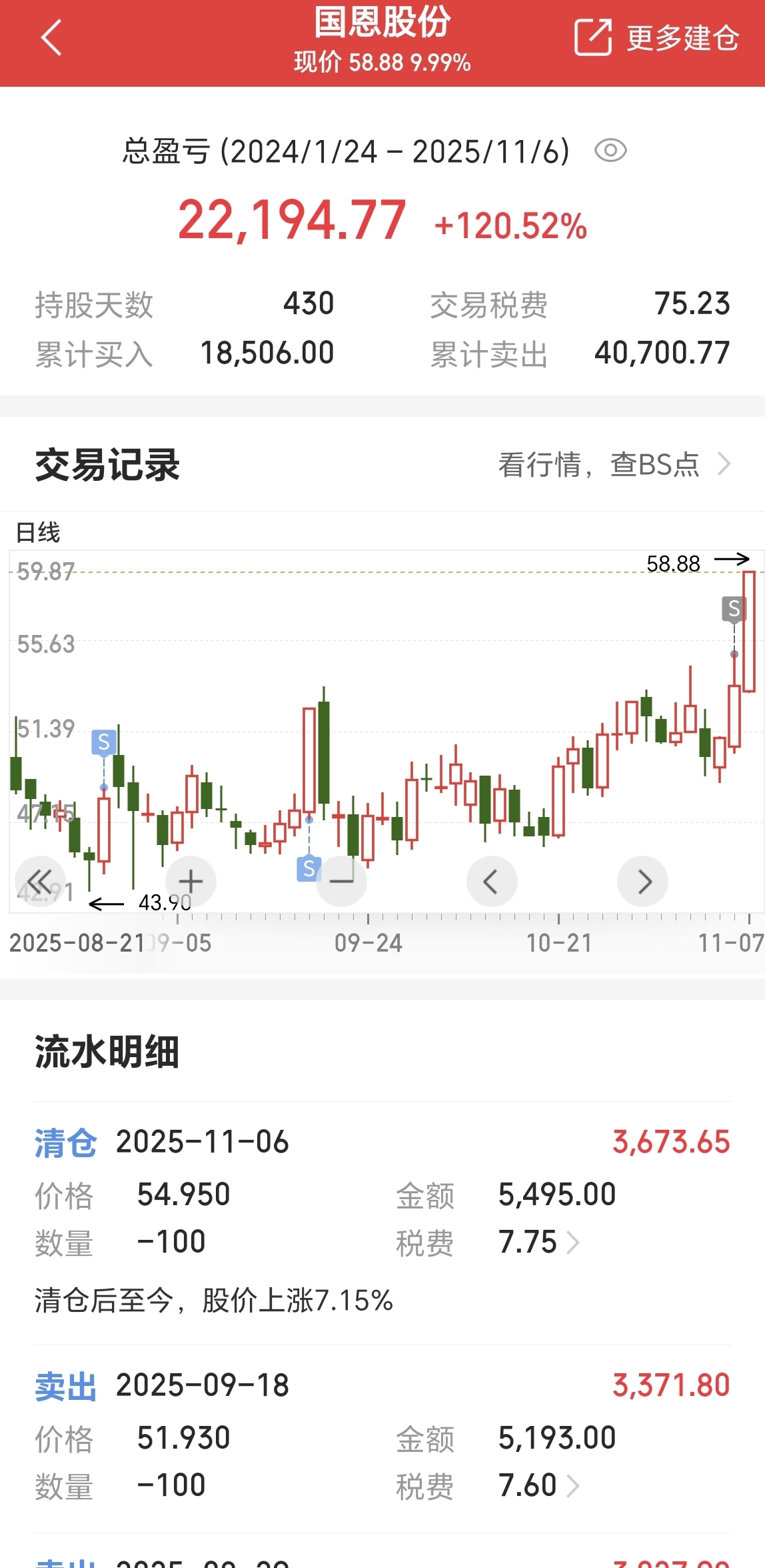 持仓430天,虽然昨天卖了最后一笔,今天又涨停了,但是还是很开心,这是我赚的最多