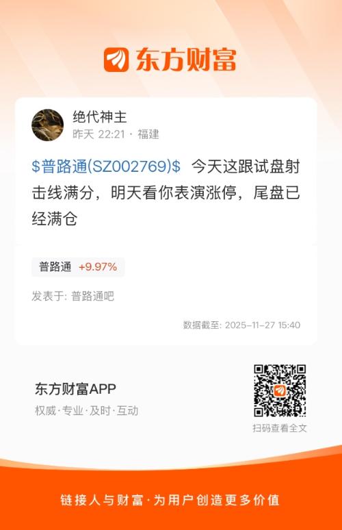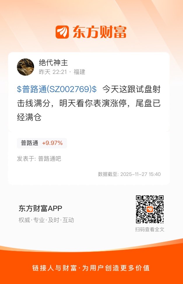 $普路通(SZ002769)$  今天这跟试盘射击线满分,明天看你表演涨停,尾盘已经满仓