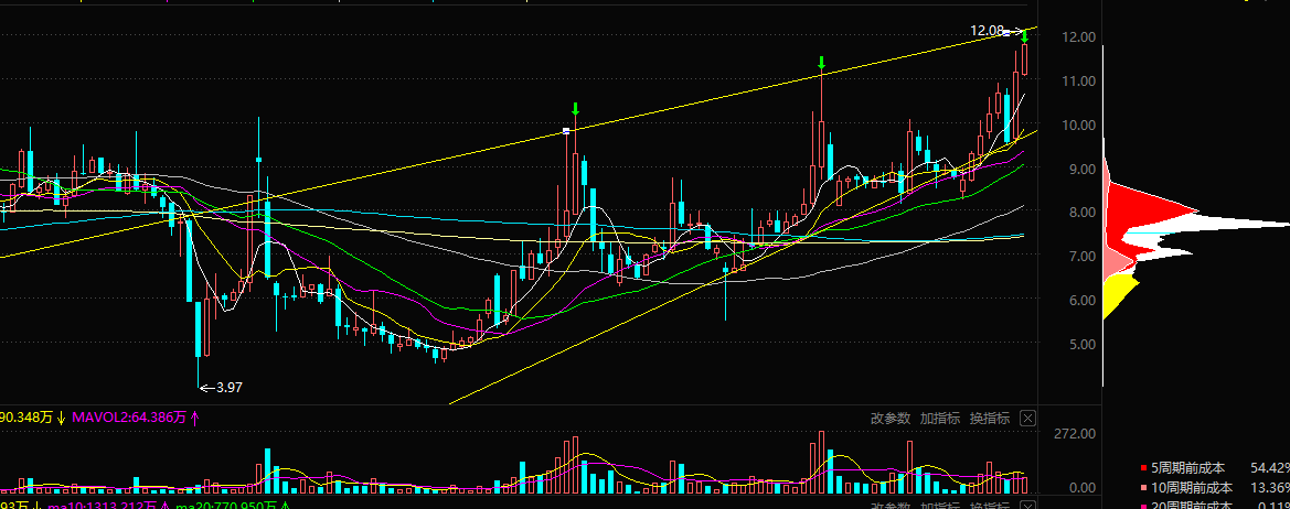 底部启动筹码集中,主动惜筹还会向上拉升!另从上方上升趋势线,明天开始回调了。。